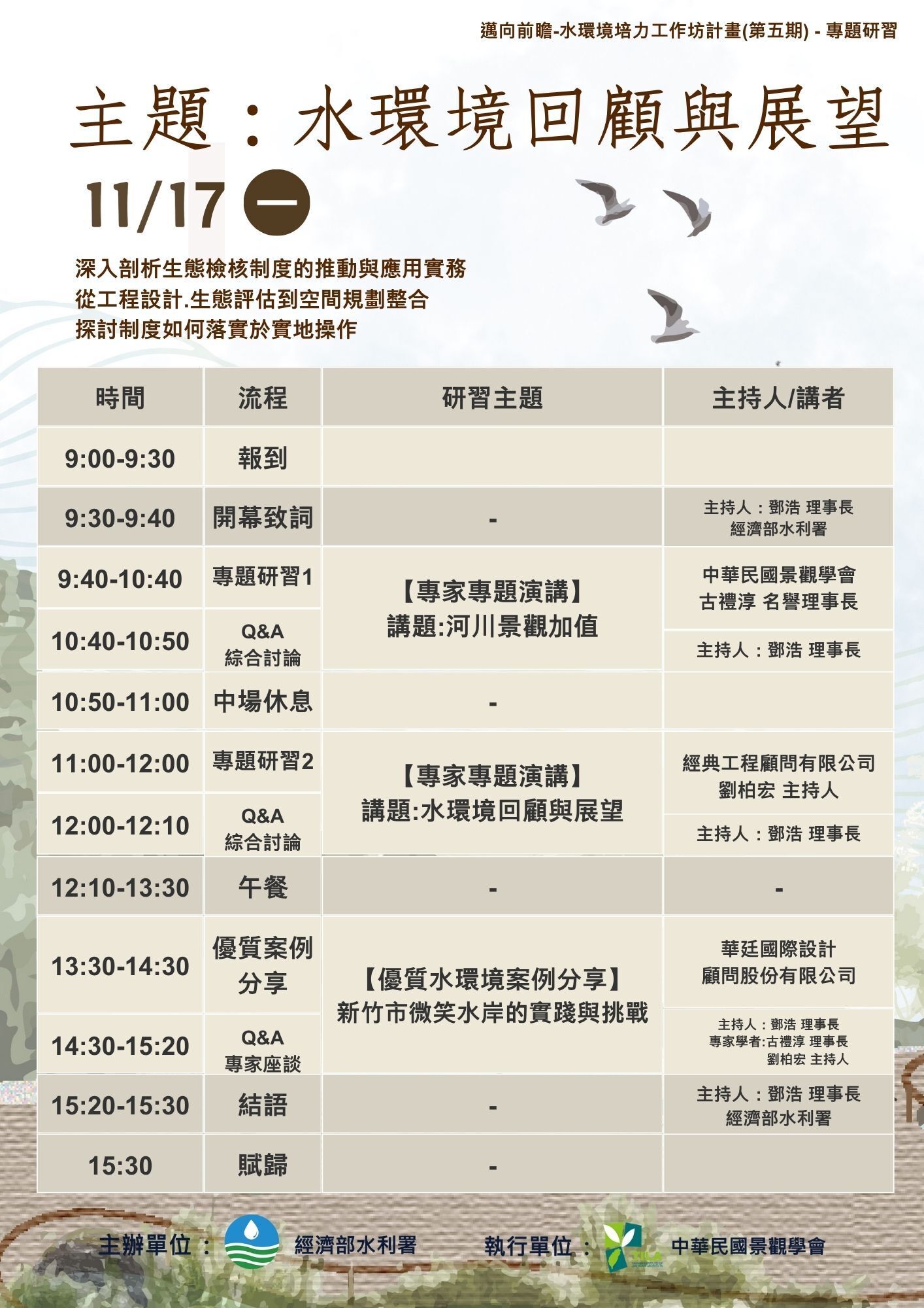 本署為提升「全國水環境改善計畫」各執行機關實際承辦業務同仁及相關從業人員的實務能力,並建立經驗交流分享平台,本年度持續舉辦專題研習活動,以「生態檢核實行與實踐」及「水環境回顧與展望」為主題,邀請專家學者及優質案例執行團隊分享專業觀念與執行經驗,提供承辦同仁及從業人員相互學習、精進的機會,並強化對常見錯誤態樣之辨識與預防,及增加未來在推動水環境建設上解決問題與運用優良解方之能力。
