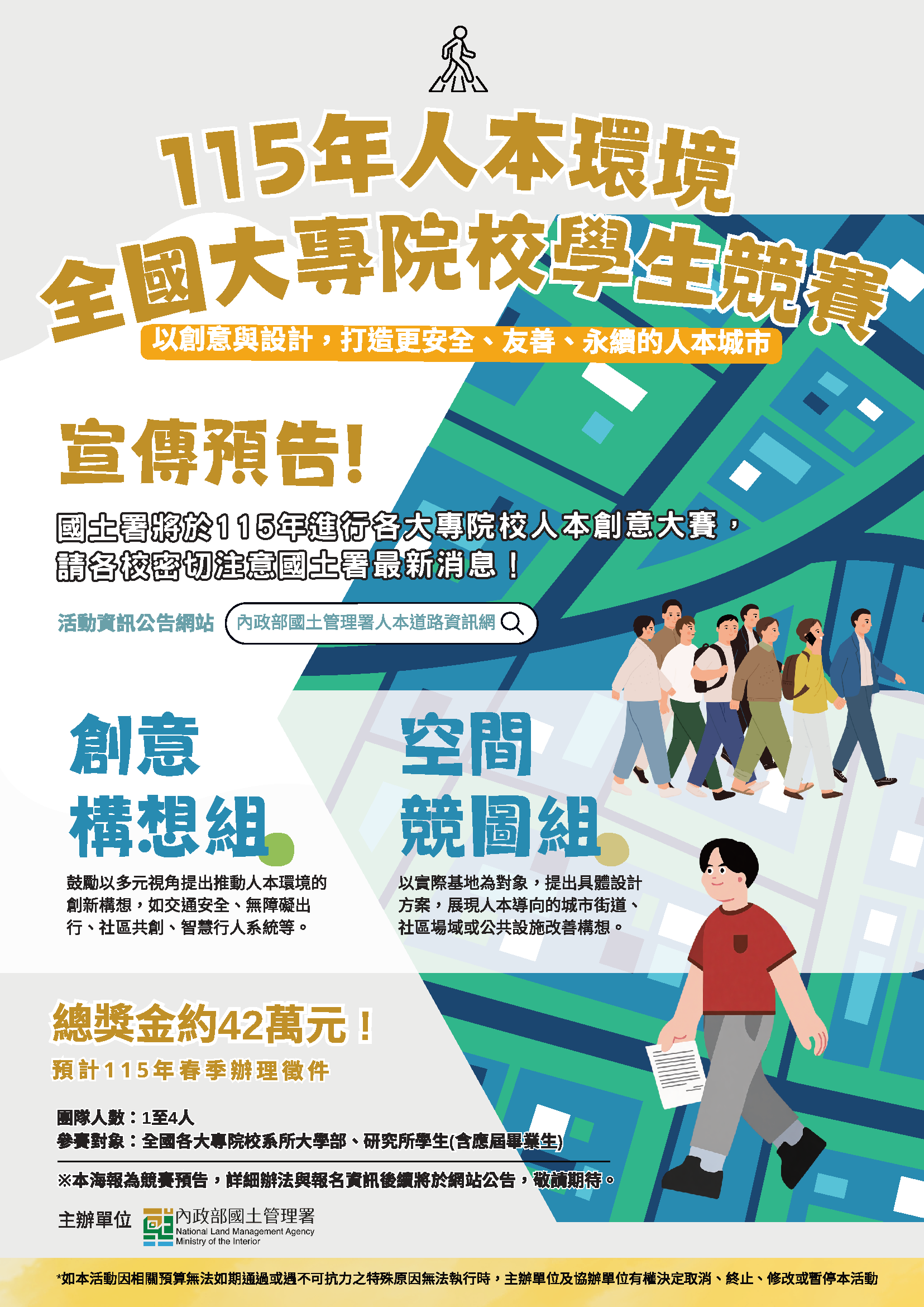 內政部國土管理署預計於 115 年春季 辦理「人本環境全國大專院校學生競賽」徵件活動,鼓勵全國大專院校學生以創意與空間設計回應人本街道、友善社區及相關議題,歡迎踴躍參與。