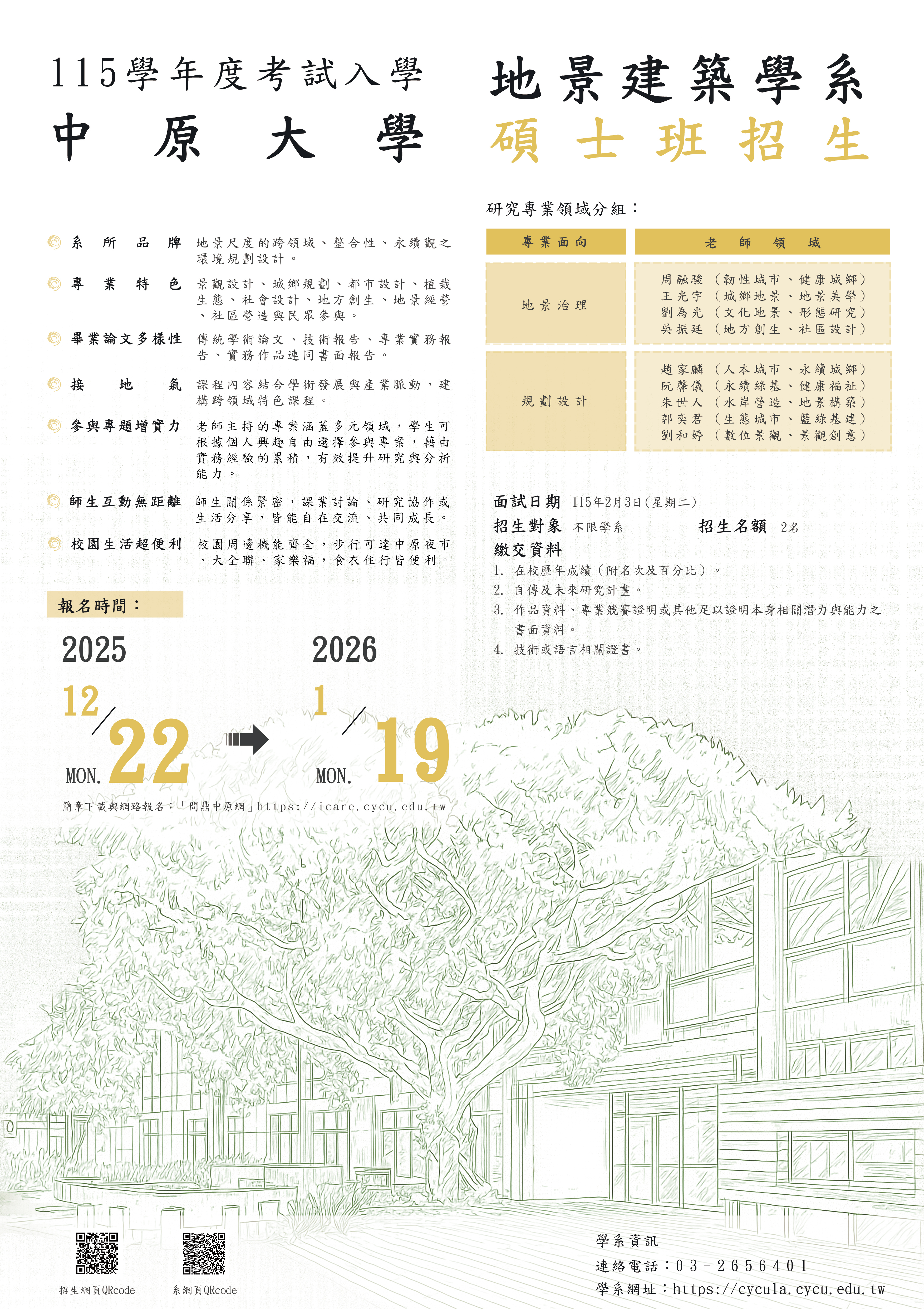 115學年度 中原大學地景建築學系碩士班甄試招生
