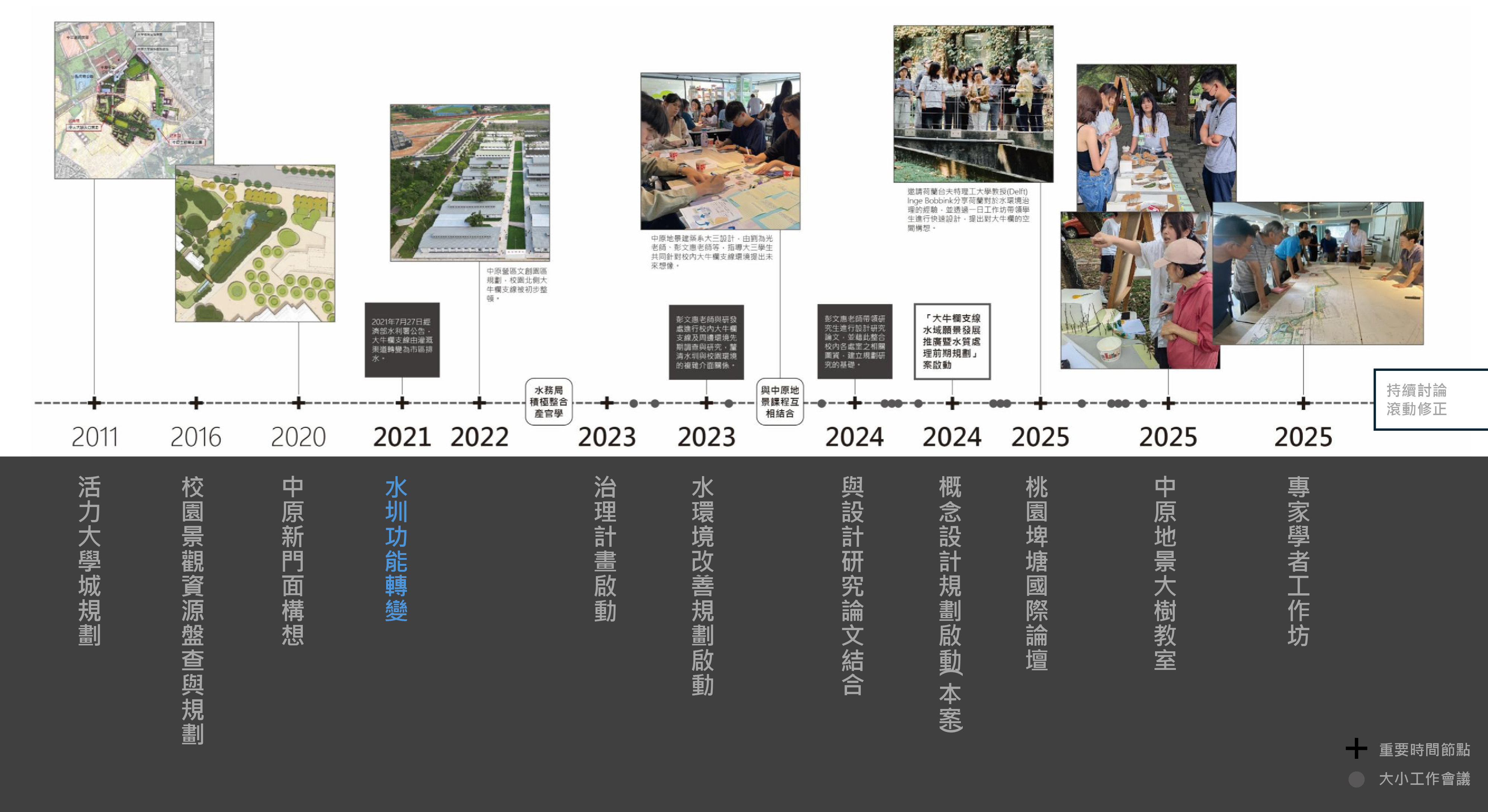 2011年因配合當時的桃園鐵路高架化計畫(後改為地下化),由喻肇青老師提出「中原大學校園規劃綱要計畫」開始盤點校園資源、重新串連與規劃校園的藍綠軸帶;2016年地景系彭文惠老師透過校園景觀調查計畫包含14A埤塘、喬木與水圳,確立埤塘空間與校園的銜接關係,並提出了水圳環境美質再造的建議;2020年彭文惠老師、陳宇進老師帶領研究生向校長提出「中原村及鐵道沿線發展」之可行性規劃,探究未來中原車站開通後校園北校區的空間規劃,其中針對大牛欄支圳有初步的構想;2021年大牛欄支圳功能轉變,由經濟部水利署公告為桃園市市管區域排水;2023年桃園市政府水利局公開招標,邀請水利技師與工程顧問公司針對大牛欄支線作為區域排水、防洪的水量計畫及相關土地權屬釐清,同時委託彭文惠老師團隊進行水環境改善空間規劃。於是,校園在前瞻基礎建設的作用力下,面臨軌道建設台鐵地下化(中原站的出現)與水環境建設(大牛欄支圳治理)的兩項重大改變。