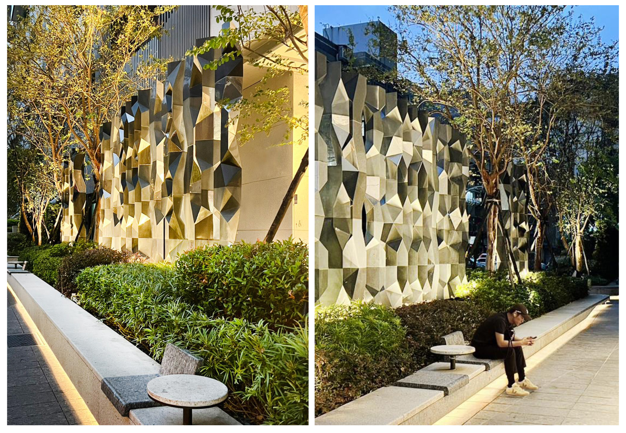景觀設計以菱鑽的設計語彙,一座藝術裝置座落於一樓朝南的廊道之中。以重複而純粹的幾何單元為語言,交疊、連結、延展,構築出彷彿無限擴張的視覺意象,呼應建築本體的華麗姿態。作品選用黑、灰與透明鏡面不鏽鋼元件結合花崗石材質,層層切削出如鑽面般的多重折線,折射出細膩光影與晶體質感。金屬的鏡澤與石材的厚實交織出優雅而豐富的紋理,將珍貴與高雅的形體語彙融入建築脈絡之中,成為空間中耀眼的視覺焦點。