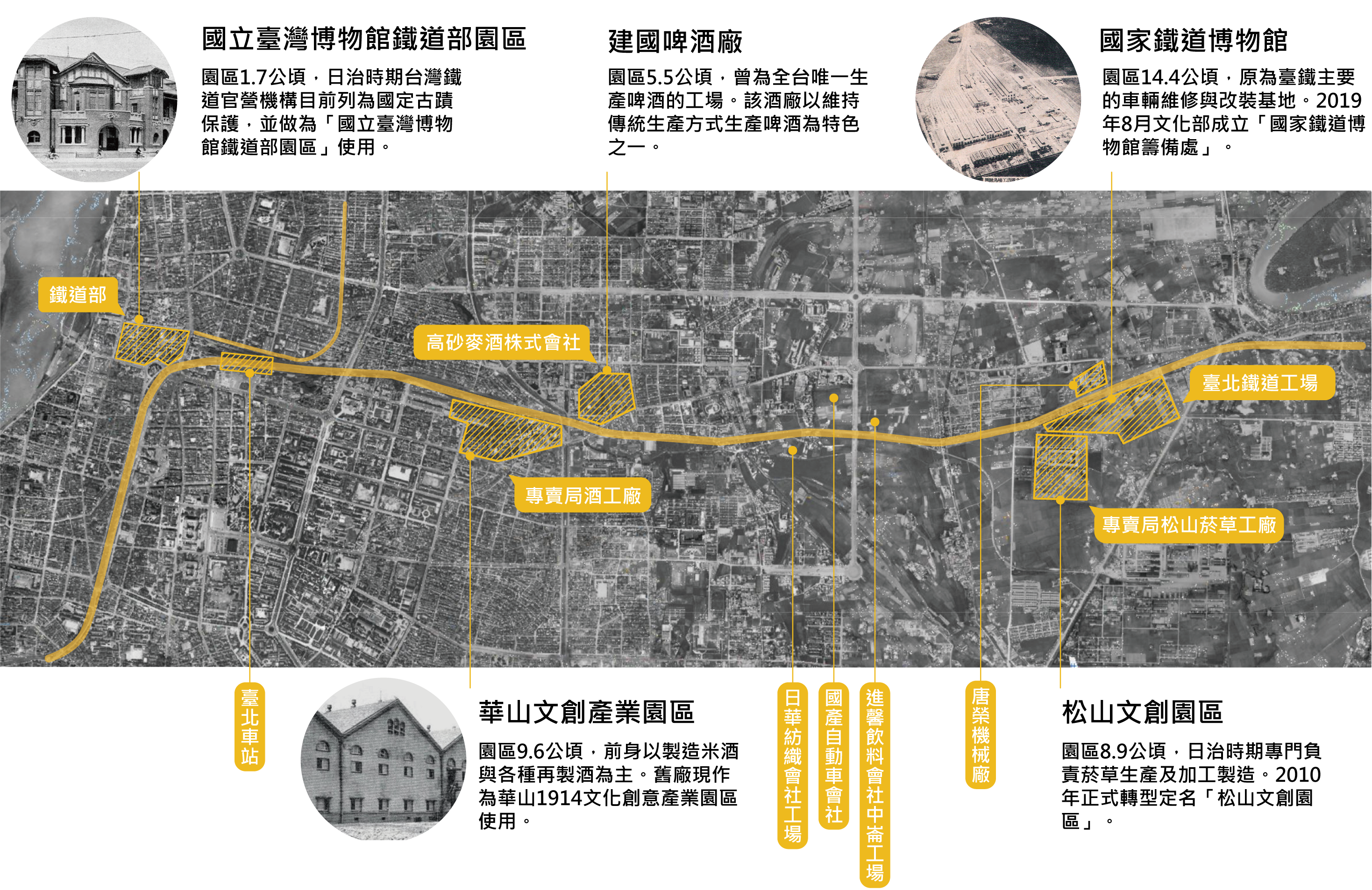 日治時期為了促進臺北的工業化發展,曾在鐵路沿線的農田地景上設立諸多如酒、菸草及鐵路相關的工廠。戰後隨著都市化的演進,臺北市的地景逐漸從農業轉向高樓林立的工商業。縱貫鐵路也從地上潛至地下,又凌空搭建了一條市民大道高架。位於西側末端的臺北機廠則是這條產業廊帶上的據點之一,也是見證臺灣鐵路維修技術發展的重要產業遺產。