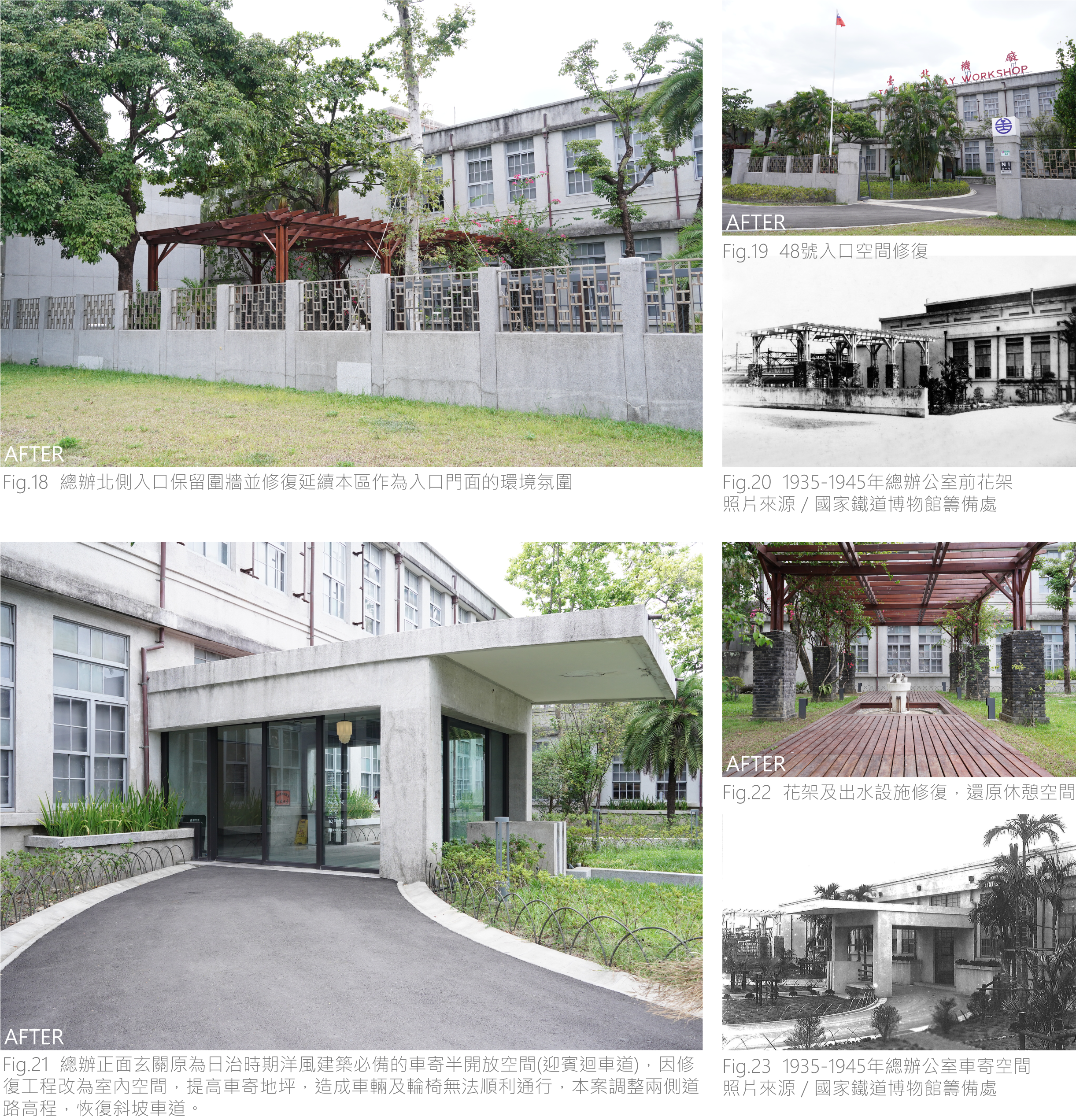 48號大門的總辦公室前院曾是整座臺北機廠的入口門面,在象徵主要入口與迎賓功能的車寄周邊,保留了日治時期所設置的木花架、玄關前水池;戰後增添具有臺鐵符號象徵意義的紀念碑與圍牆,以及適應熱帶南國環境的黃椰子、杜鵑等植栽。透過保留並修復這些各時期遺留下的庭園景觀設施,讓歷史環境能被再現與紀念。
