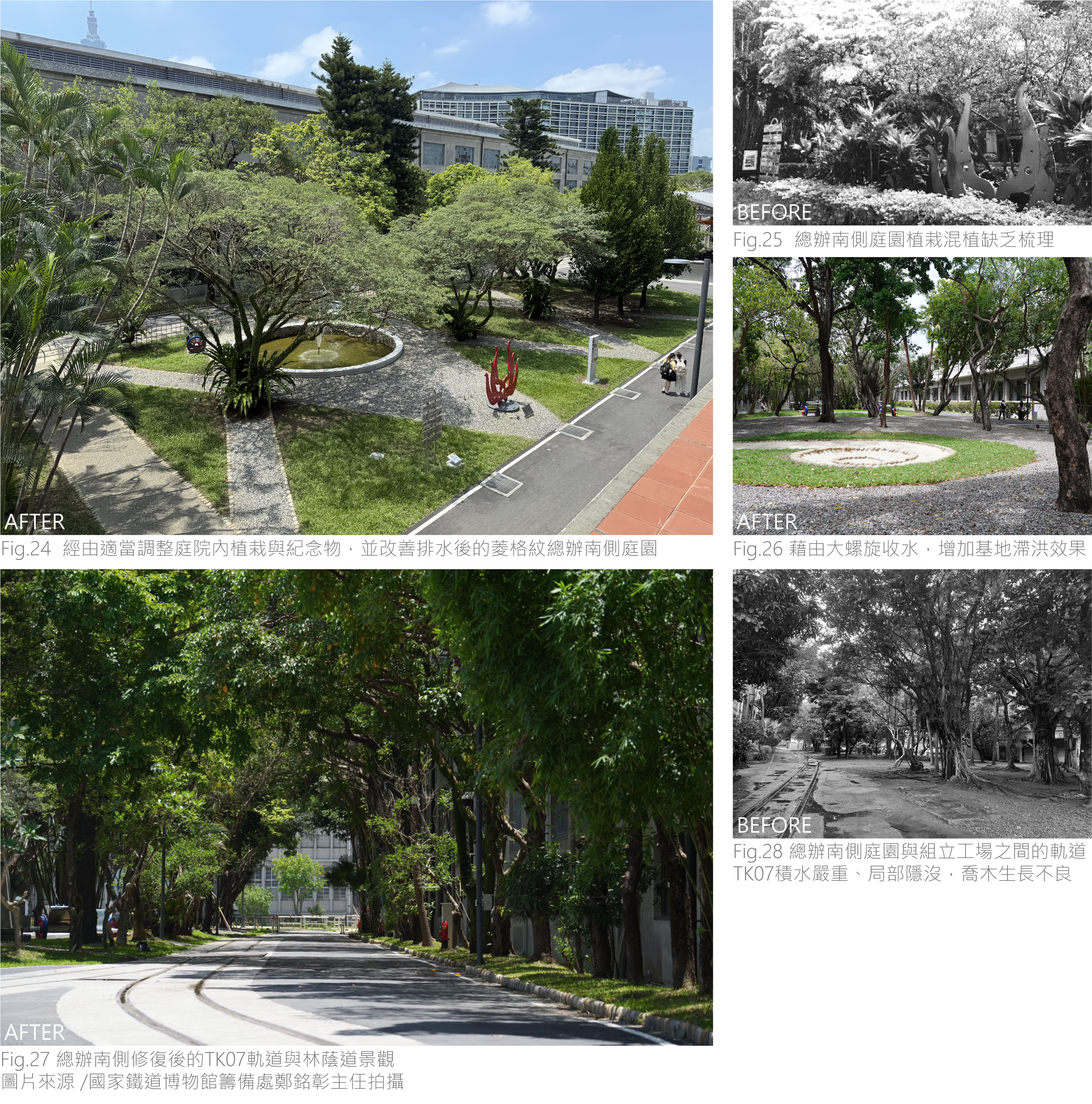 植物在景觀設計上是重要元素 ,本次戸外的文資景觀修復除了尋找記錄及老照片外,也用訪談方式從記憶找回失落的景觀空間。
