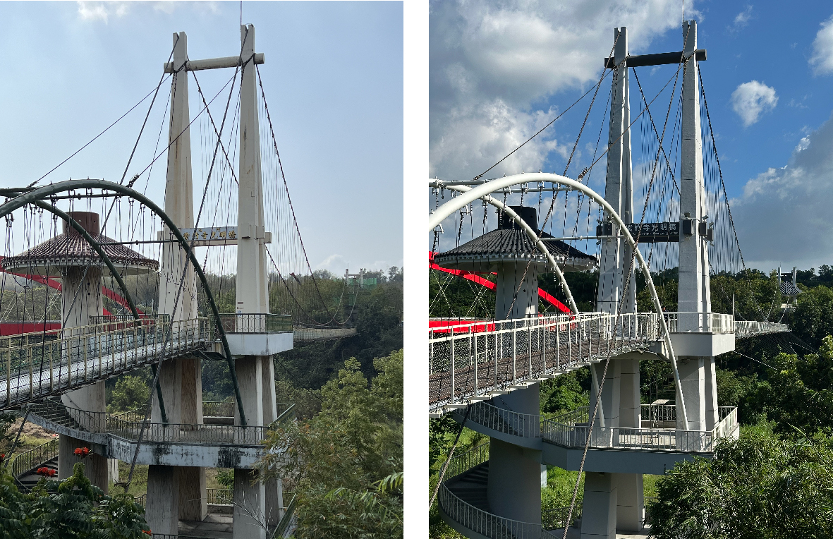 2. 光明吊橋為串聯紫竹寺與內門觀光休閒園區的重要動線,藉由本計畫一併美化橋塔立面,形塑地方特色地標;重新研擬立面色彩方案,塗裝顏色採低調簡約色系,減少對周邊環境視覺衝擊。