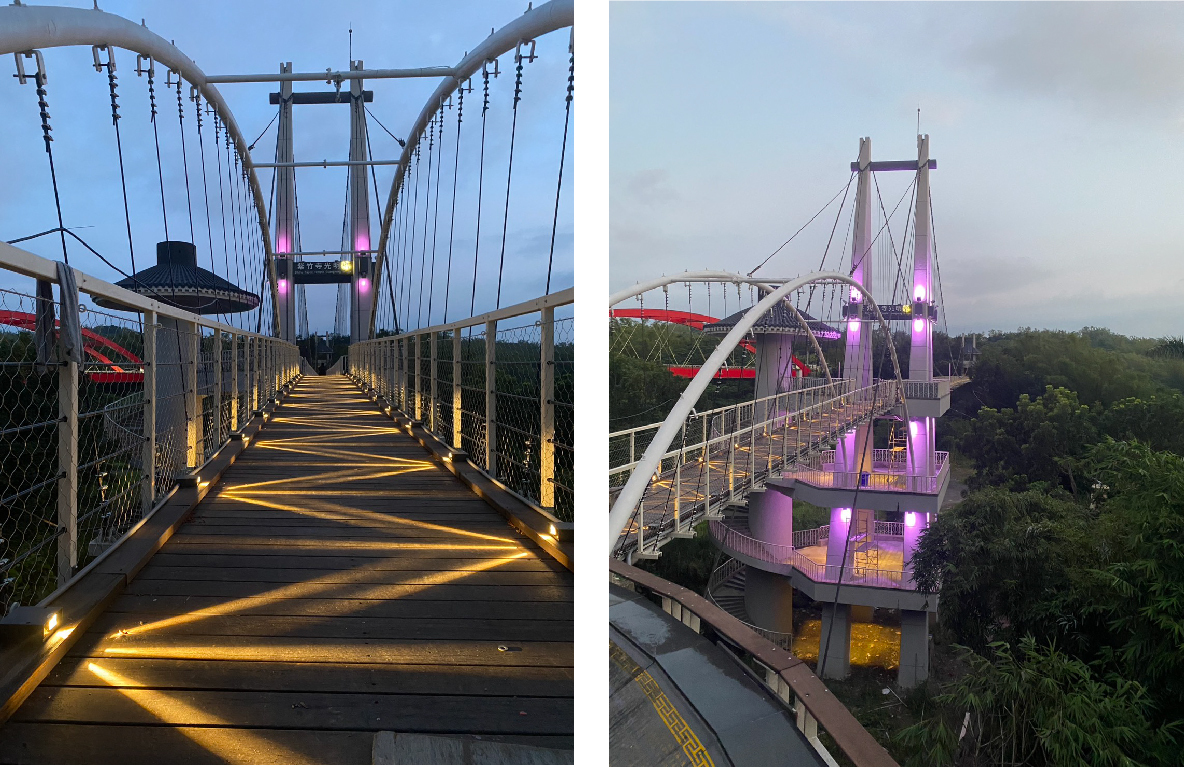 考量後續觀光休閒園區及紫竹寺有夜間使用之需求並確保行人安全,利用燈光點綴氣氛,營造吊橋夜間照明氛圍;橋塔配合紫竹寺廟方節慶,設定不同的夜間照明氛圍,棧道則採用低亮度的照明,減少對環境的影響。