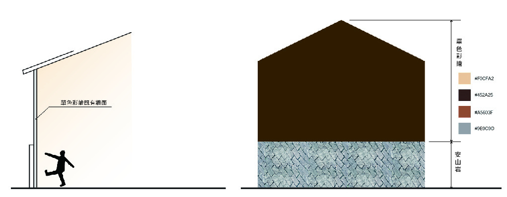 2.制定建築牆面飾材、屋頂塗料之使用手法,使用與木材相似之色系,完成後整體遊憩區景觀更具一致性,塑造「懷舊木業聚落」的整體氛圍。