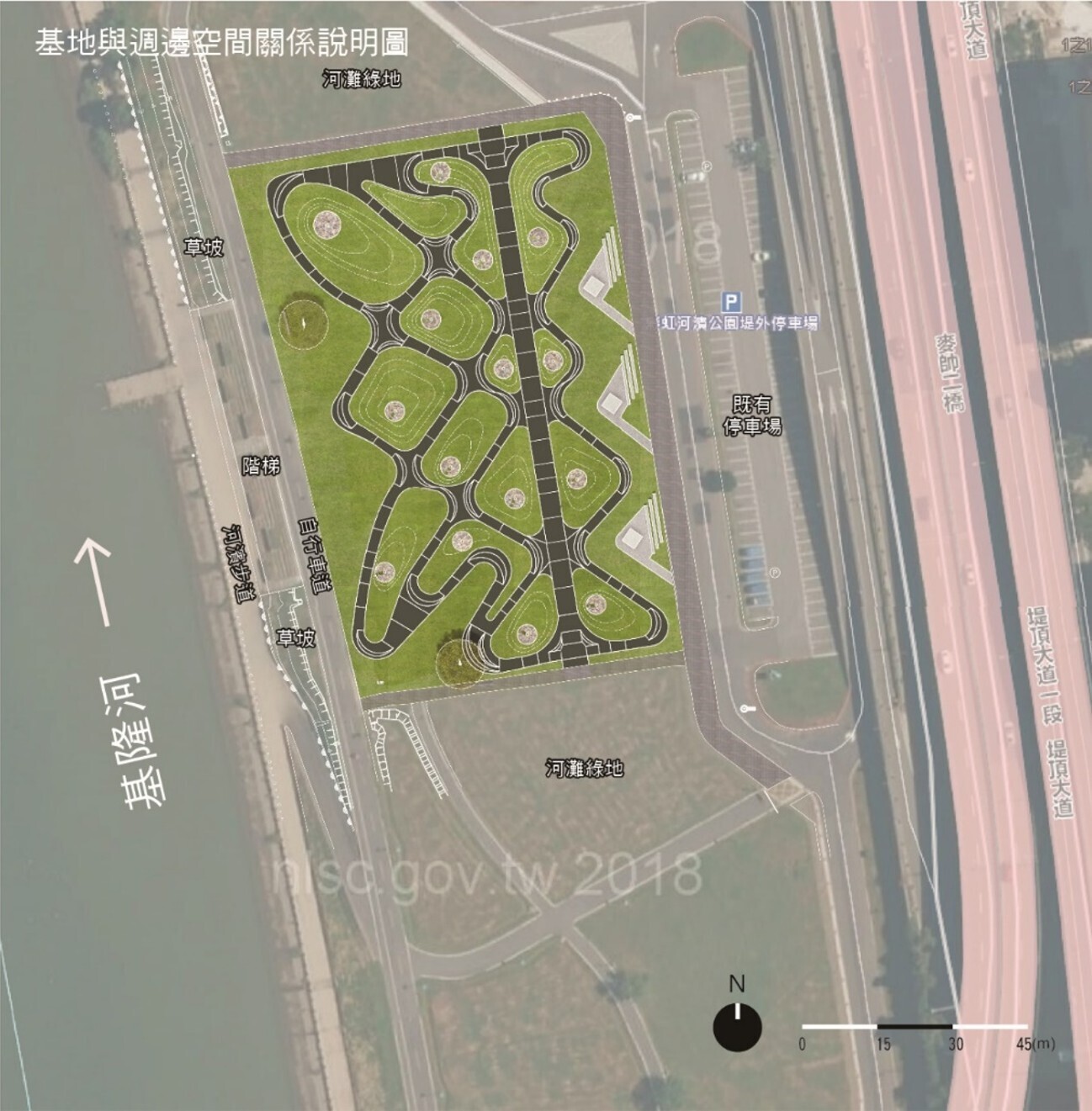 本案位於高灘地,設置場地需兼顧河防安全及場地實用性,故從河灘地既有洪泛平原功能、可及性、新設場地定位、續接既有動線、水利法規高度限制等多方面考量著手設計。