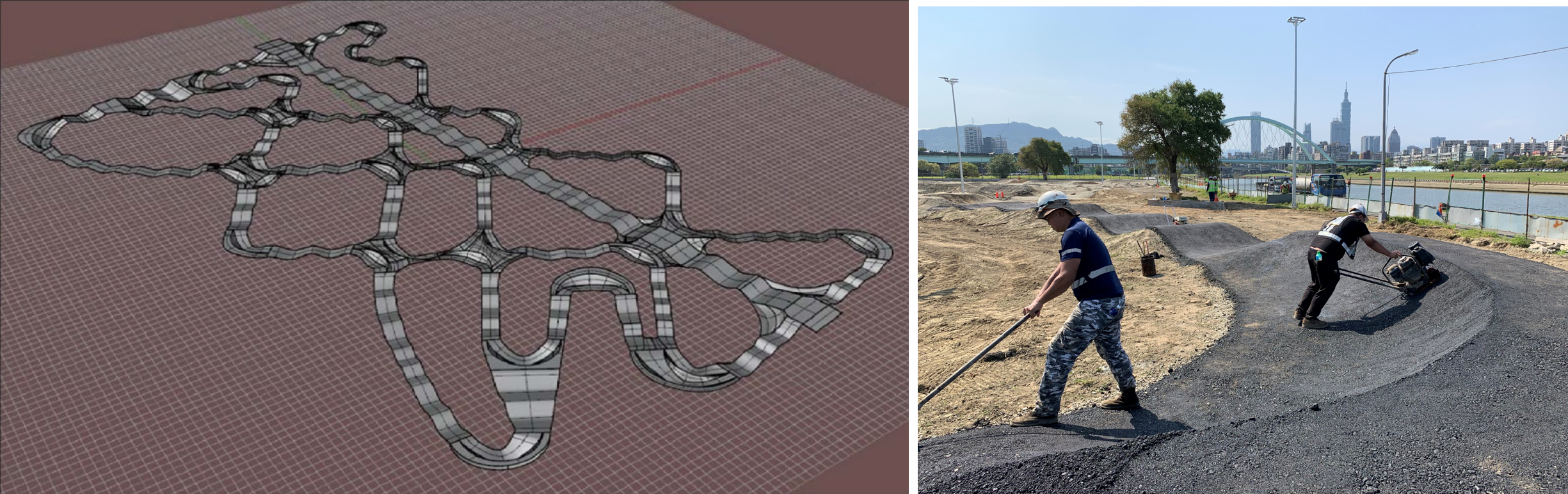 Pump Track場地幾乎沒有任何一處是平坦的,所以設計須藉由底土層、碎石級配層、AC層等各層的來回整理,來滿足賽道滑順的高低起伏及多重曲面的可能性。並在滿足水利法的前提下,運用整地降挖,營造地形起伏,並配合排水設計,以利後續賽道維護及管理。