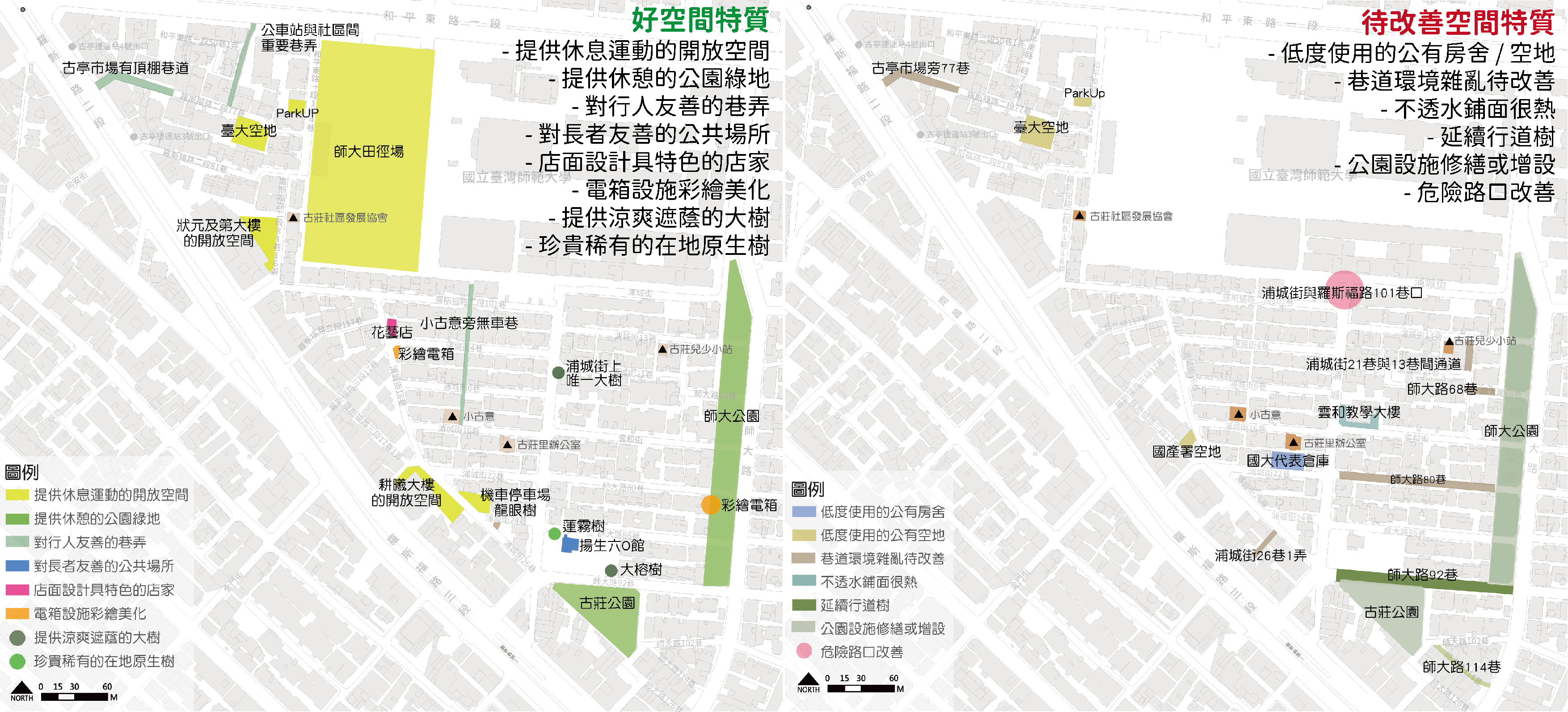 民眾認為好的街區空間特質,例如是要能提供休息運動的空間、休憩的公園綠地等,待改善的空間像是低度使用的公有房地、環境雜亂巷道、危險路口等。