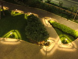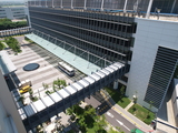 企業總部前鏡面水池,沉靜工作緊張情境;連續性舖面整合聯繫建築物與戶外林蔭廣場及車道空間。
