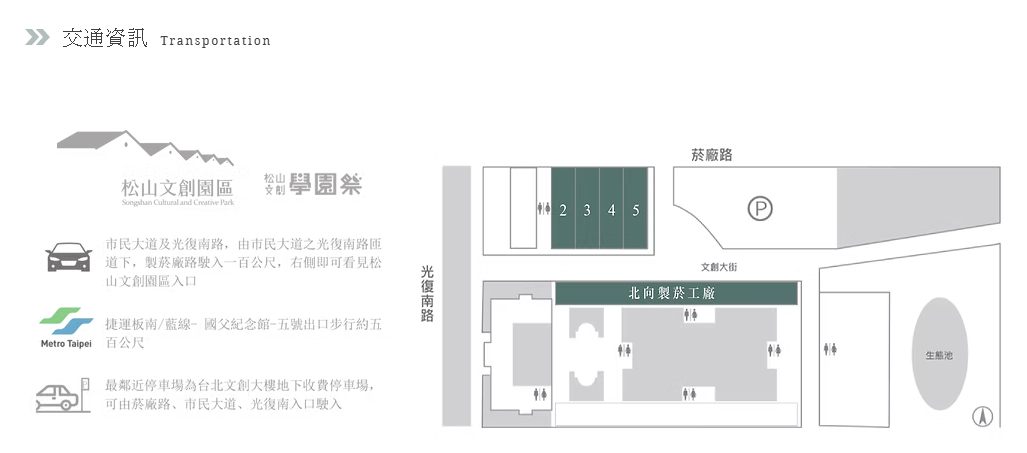開車: 由市民大道/光復南路匝道下,右轉菸廠路進入。停車可利用「台北文創大樓地下停車場」。