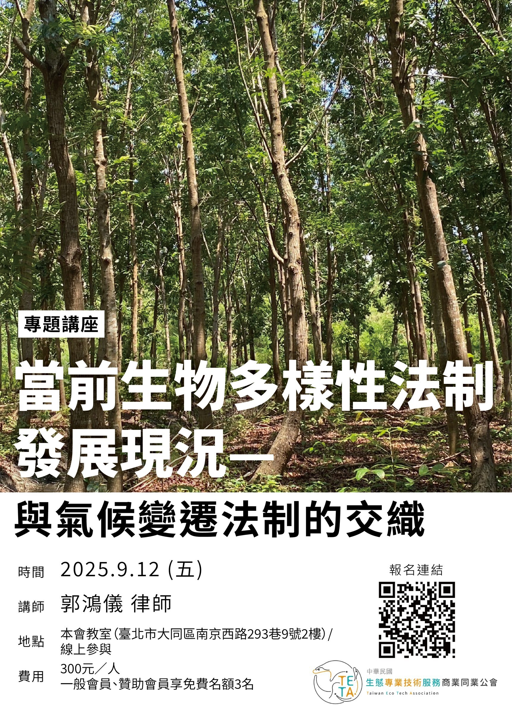 隨著全球氣候變遷加劇,生物多樣性保育已成為國際關注焦點,相關法制框架也持續演進發展。生態專業工作者在執行相關業務時,也經常需要面對複雜的法規環境與政策要求,若是對於對於相關法律制度的理解不足,很可能會影響專業服務品質與合規性。