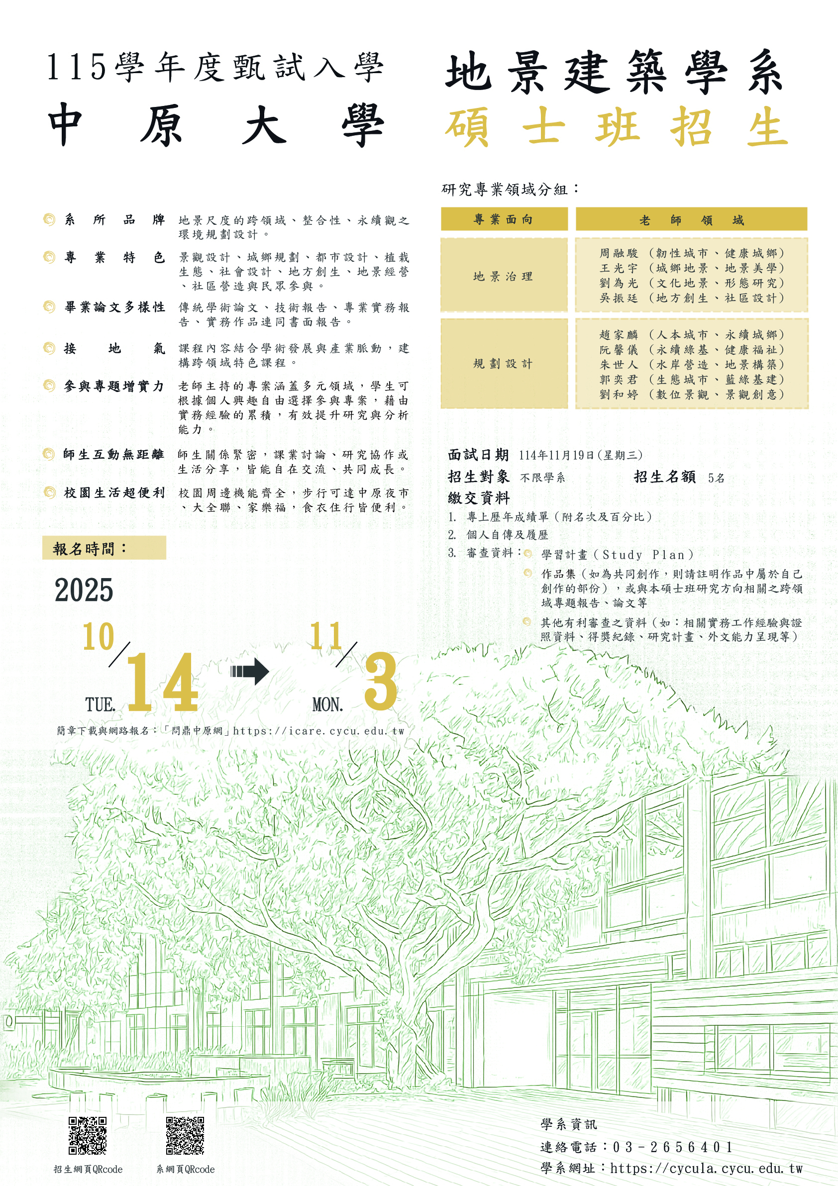 【每周NEWS】115學年度 中原大學地景建築學系碩士班甄試 招生中