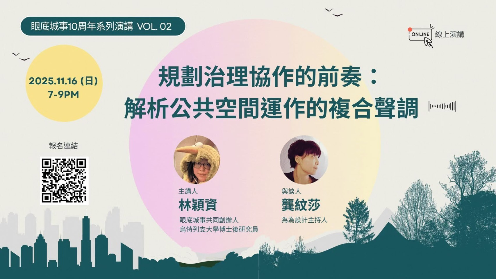 【每周NEWS】眼底城事十週年系列演講 第二場 規劃治理協作的前奏:解析公共空間運作的複合聲調