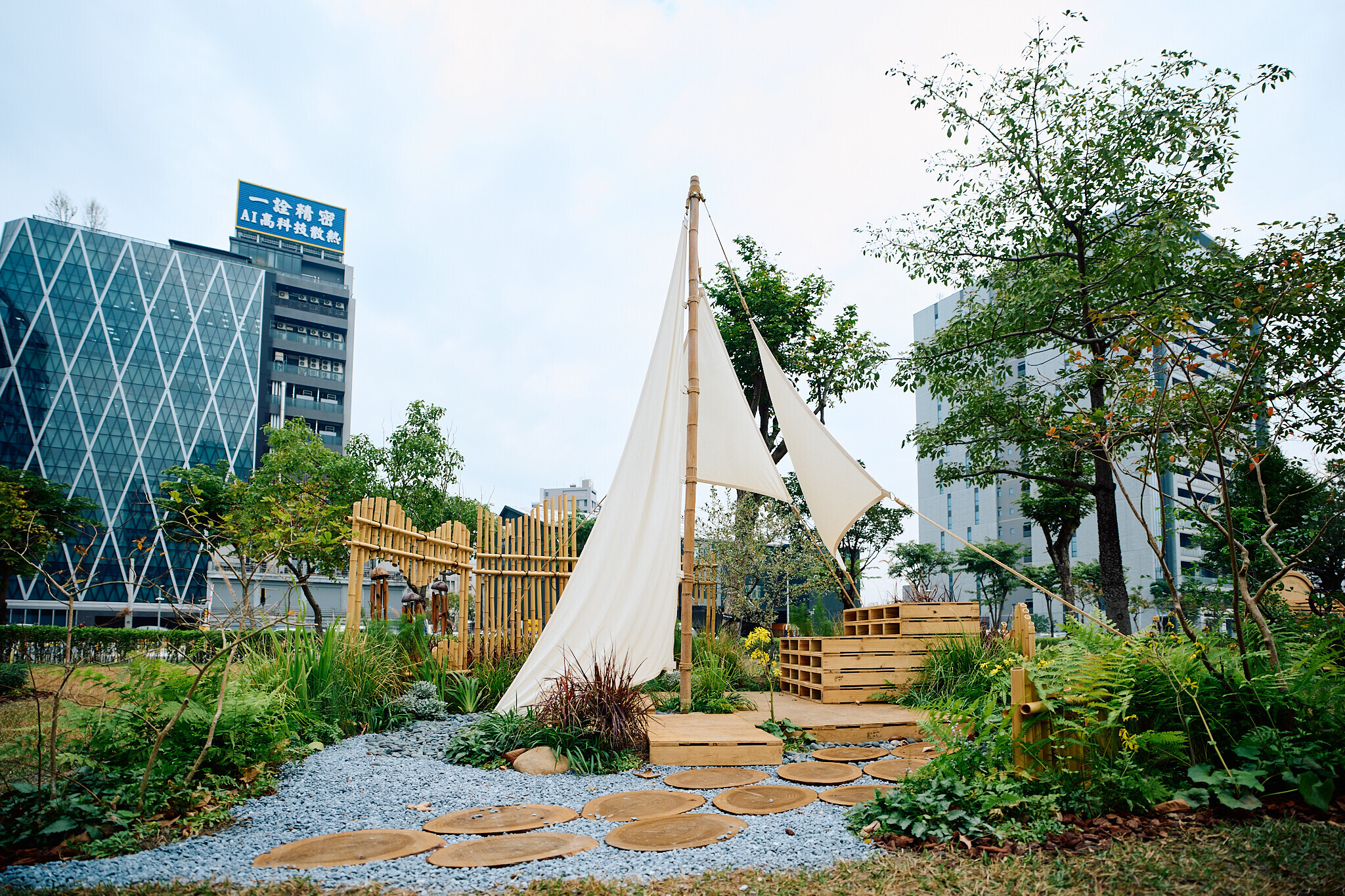 以帆形結構結合自然式植栽,呼應新莊因河而生、因織業而盛的歷史,重現水岸共生意象,展現城市由河港聚落走向現代都市的永續延續。
