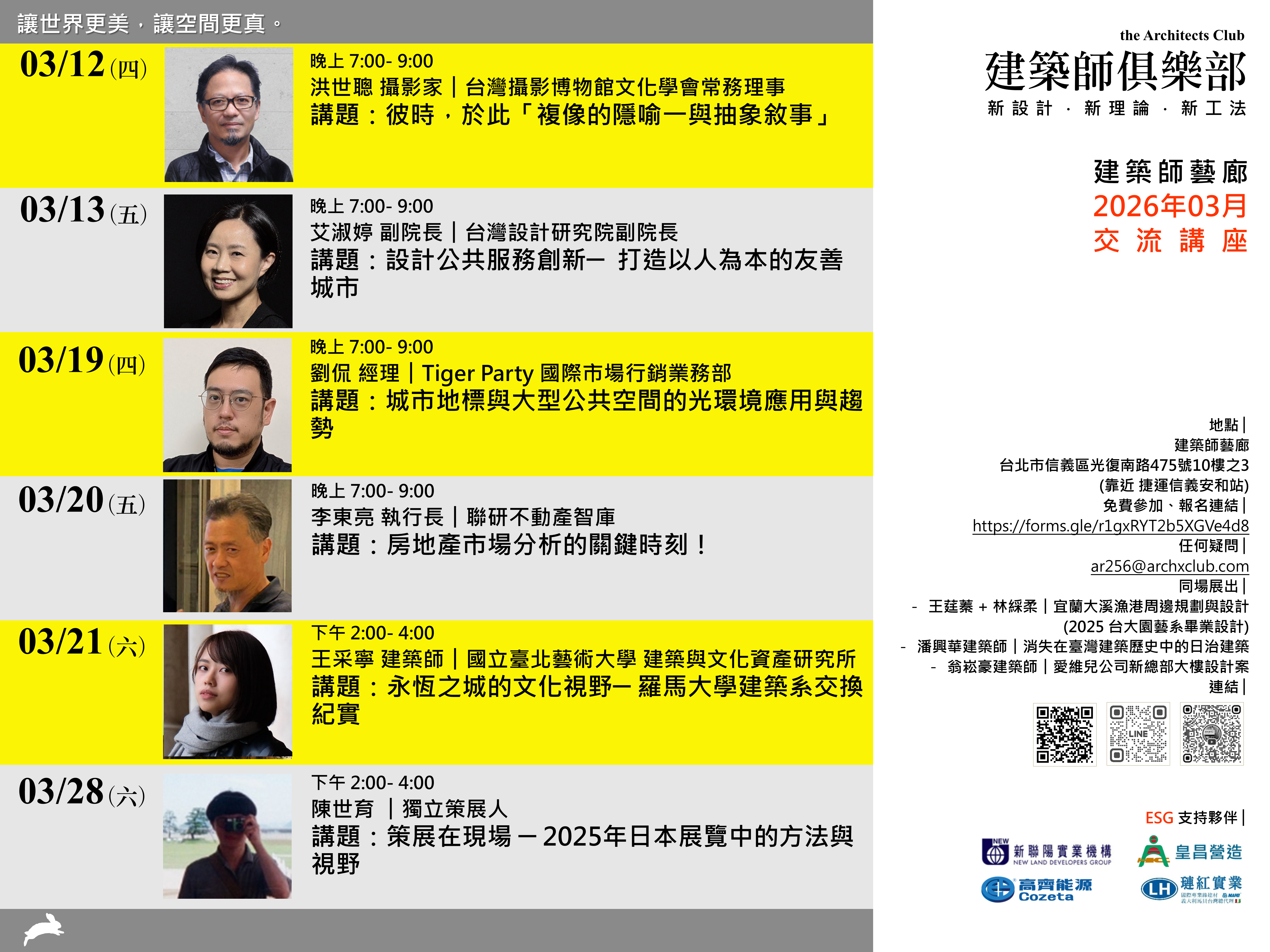 建築師俱樂部與建築讀書會將於 2026 年 3 月舉辦多場跨領域講座,邀請建築、設計、公共服務、城市光環境、不動產與策展等領域專家,分享實務經驗與觀察視角。
