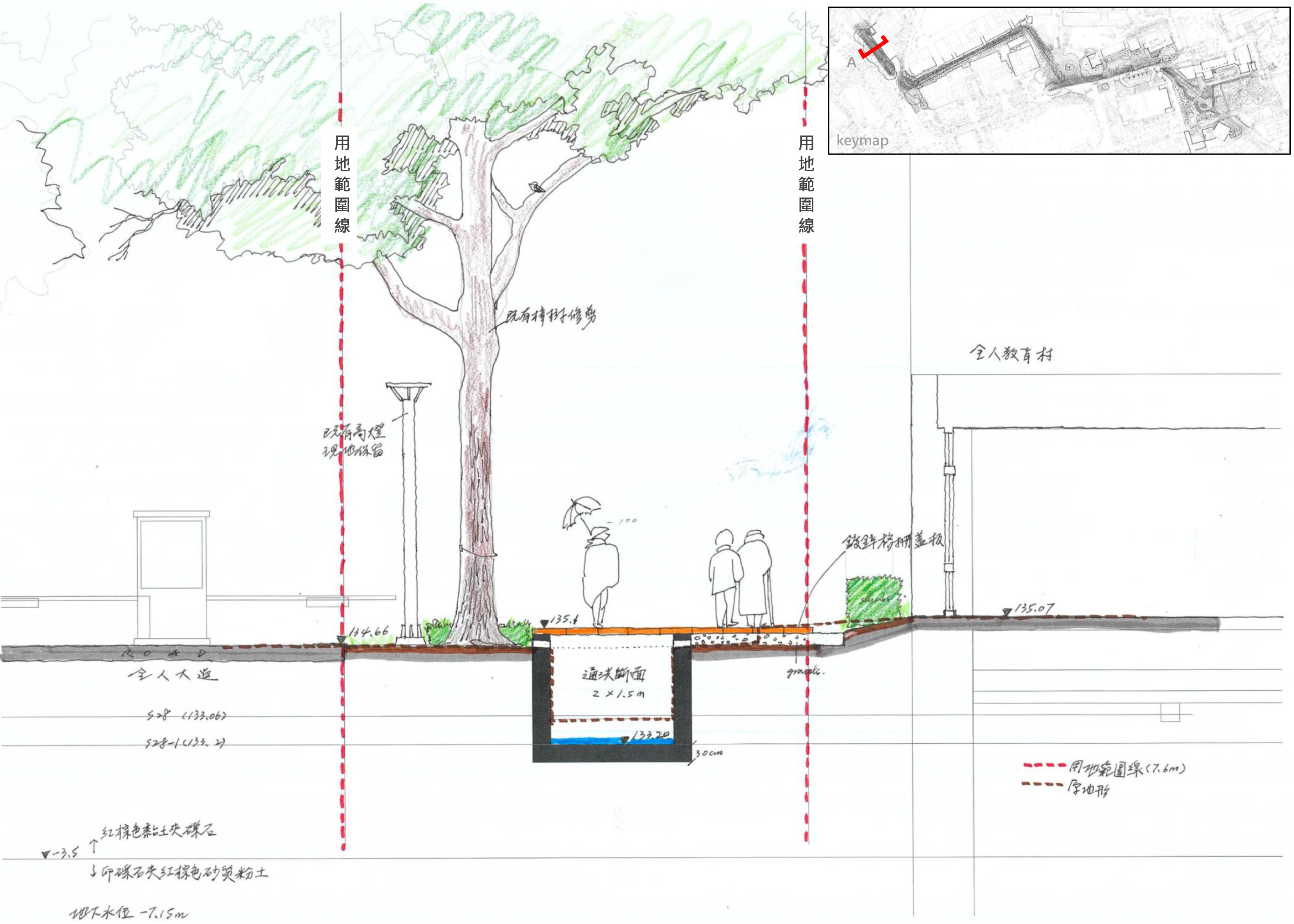 根據校園地質鑽探資料顯示,大牛欄支線周邊地下水位約介於4至7米。藉由雨水花園結合豎井設計,可使積水經自然下滲排出。中原校園歷經多次擴建,現行排水系統呈分散狀,各建築多採獨立排放。此次水圳再生可作為整合契機,重新以大牛欄支線作為校園主要排水骨幹,將零散排水匯入主幹系統,建立完整水系結構,提升整體排水效能與安全性。