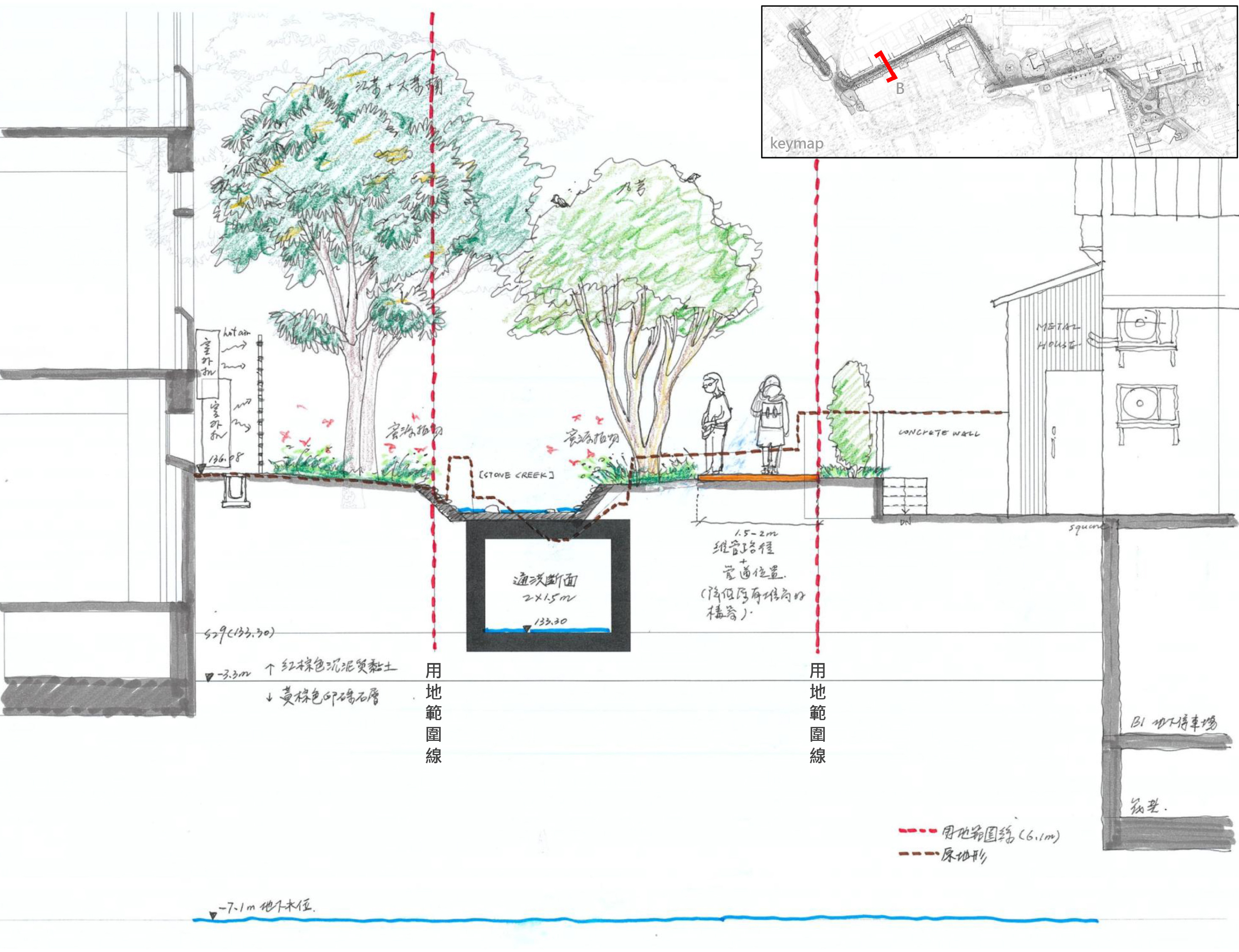 a.地面層採「雨水花園」設計,延續歷史水圳記憶。