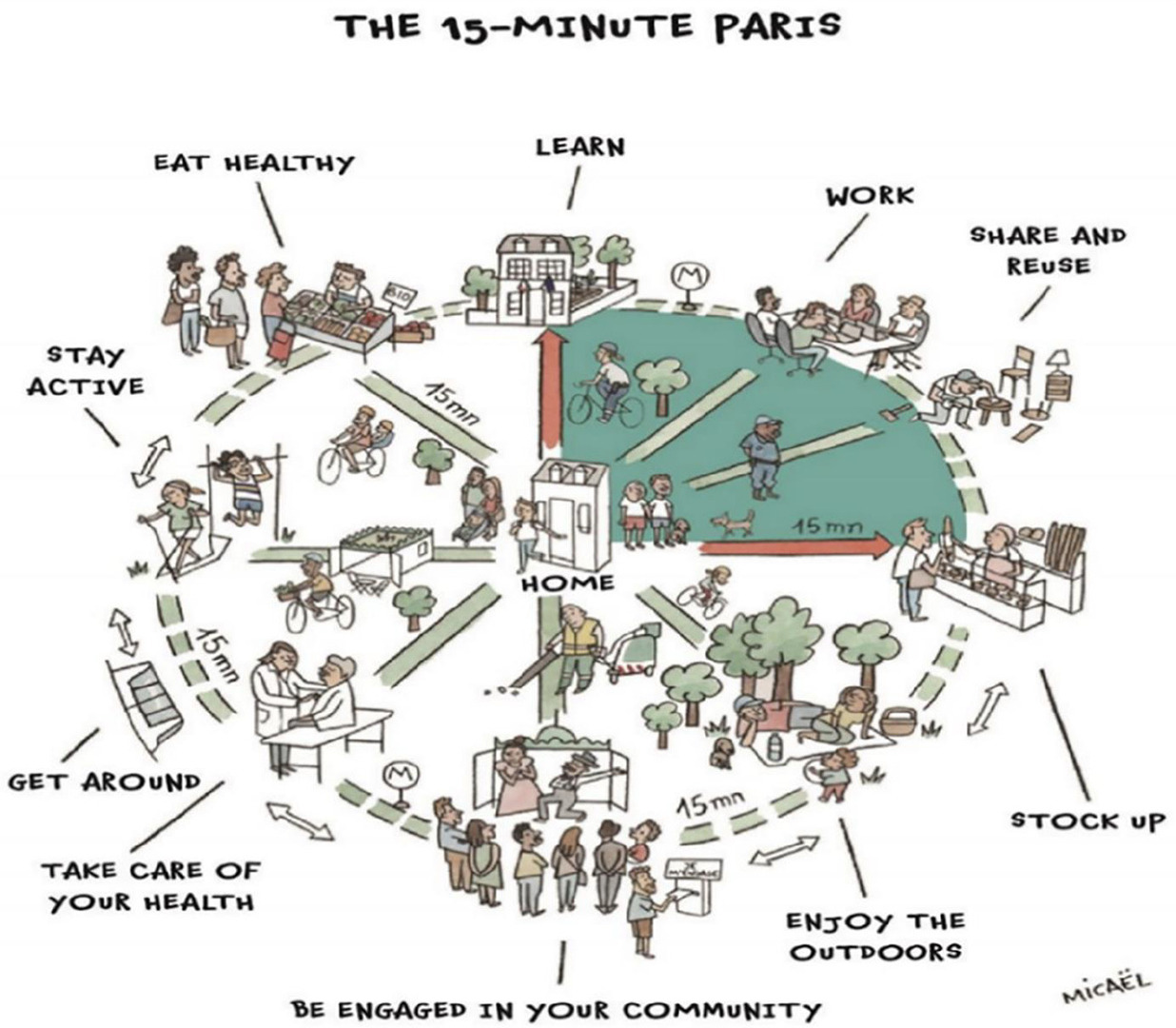 巴黎常被視為當代 15分鐘城市的象徵。該理念由 Carlos Moreno 首先提出,並在市長Anne Hidalgo於 2020 年連任競選時成為核心政見。巴黎歷史上許多街區都具備高密度與混合用途的特點,但也長期受困於交通壅塞與汽車依賴。在Hidalgo領導下,巴黎推動大規模自行車基礎設施建設,疫情期間臨時設置的「coronapistes」自行車道更象徵其決心。同時,公共空間被重新規劃,形成多功能場所。市政府亦鼓勵在地商店與診所的社區佈局,試圖實現日常需求服務的去中心化。巴黎的案例展示了15分鐘城市,如何被用作政治願景與社會動員的工具。然而,挑戰依舊存在,包括中心區的仕紳化、不同街區資源分佈的不均衡,以及汽車駕駛者的抵制等(Moreno et al., 2021)。