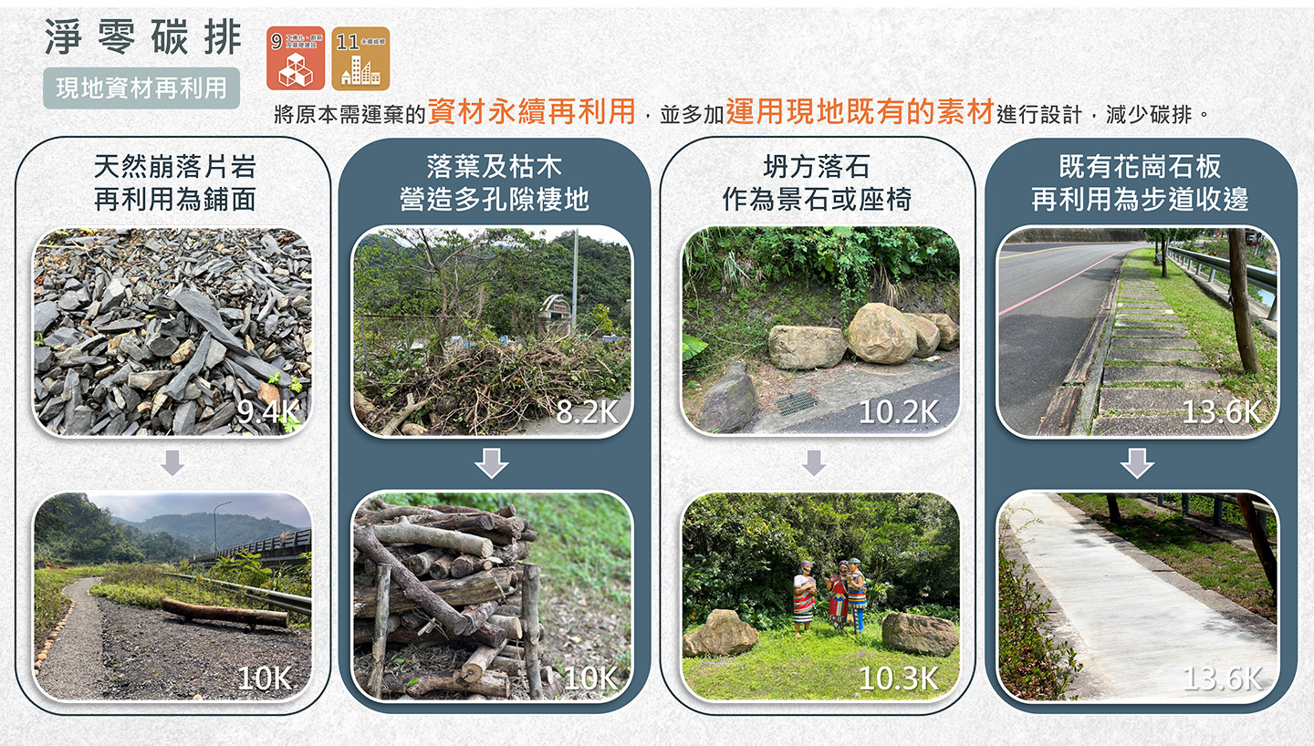 - 呼應淨零碳排目標,將崩落片岩、坍方落石、既有花崗石板等現地資材回收再利用,減少碳足跡。