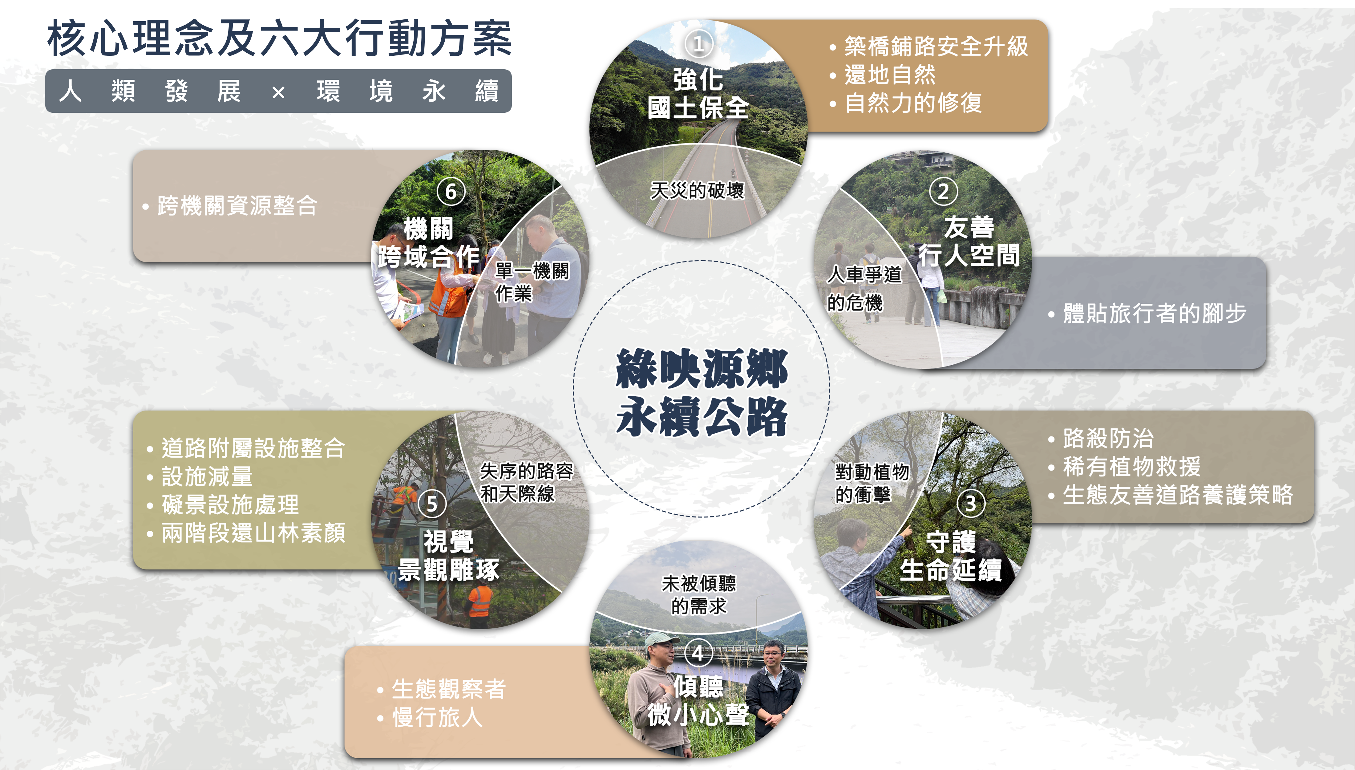 計畫以「綠映源鄉」為主題,以「人類發展 × 環境永續」為核心理念,擬定了6大行動方案:強化國土保全、友善行人空間、守護生命延續、視覺景觀雕琢、機關跨域合作、傾聽微小心聲,依照不同空間的需求及特性,建置適地適生的永續環境。