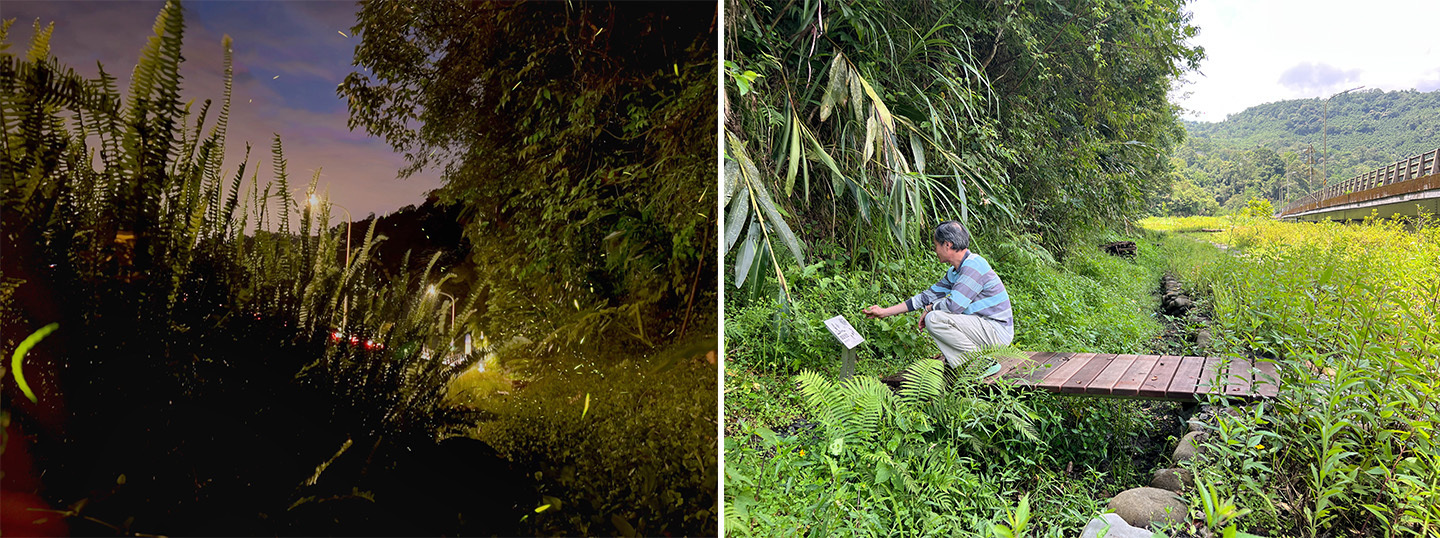 (左)圖3 利用山壁澗流水匯聚成的天然水池,營造適合螢火蟲的生活環境 (圖片來源:中和工務段)
