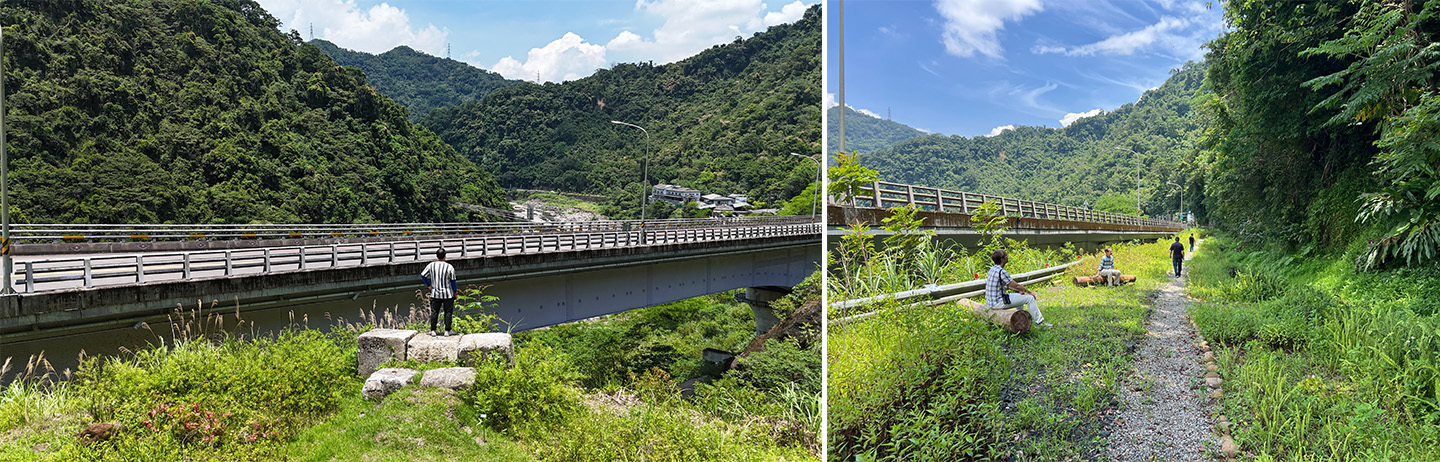 (右)圖16 此區提供用路人臨停休憩中繼站,可於此處感受山澗清泉的流水聲及徐徐微風吹拂 (圖片來源:藍里環境設計有限公司)