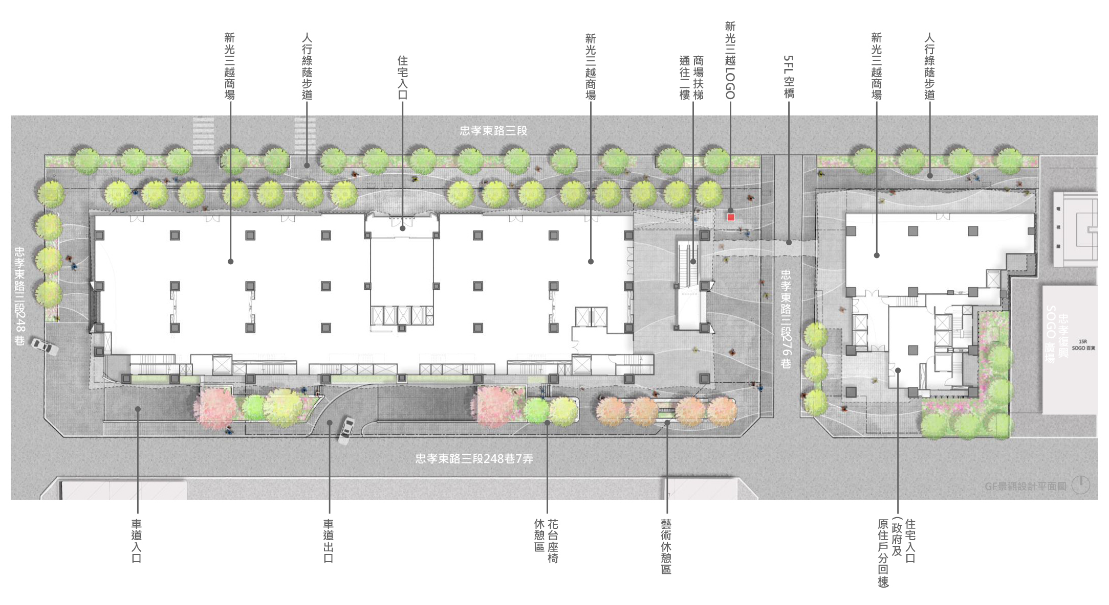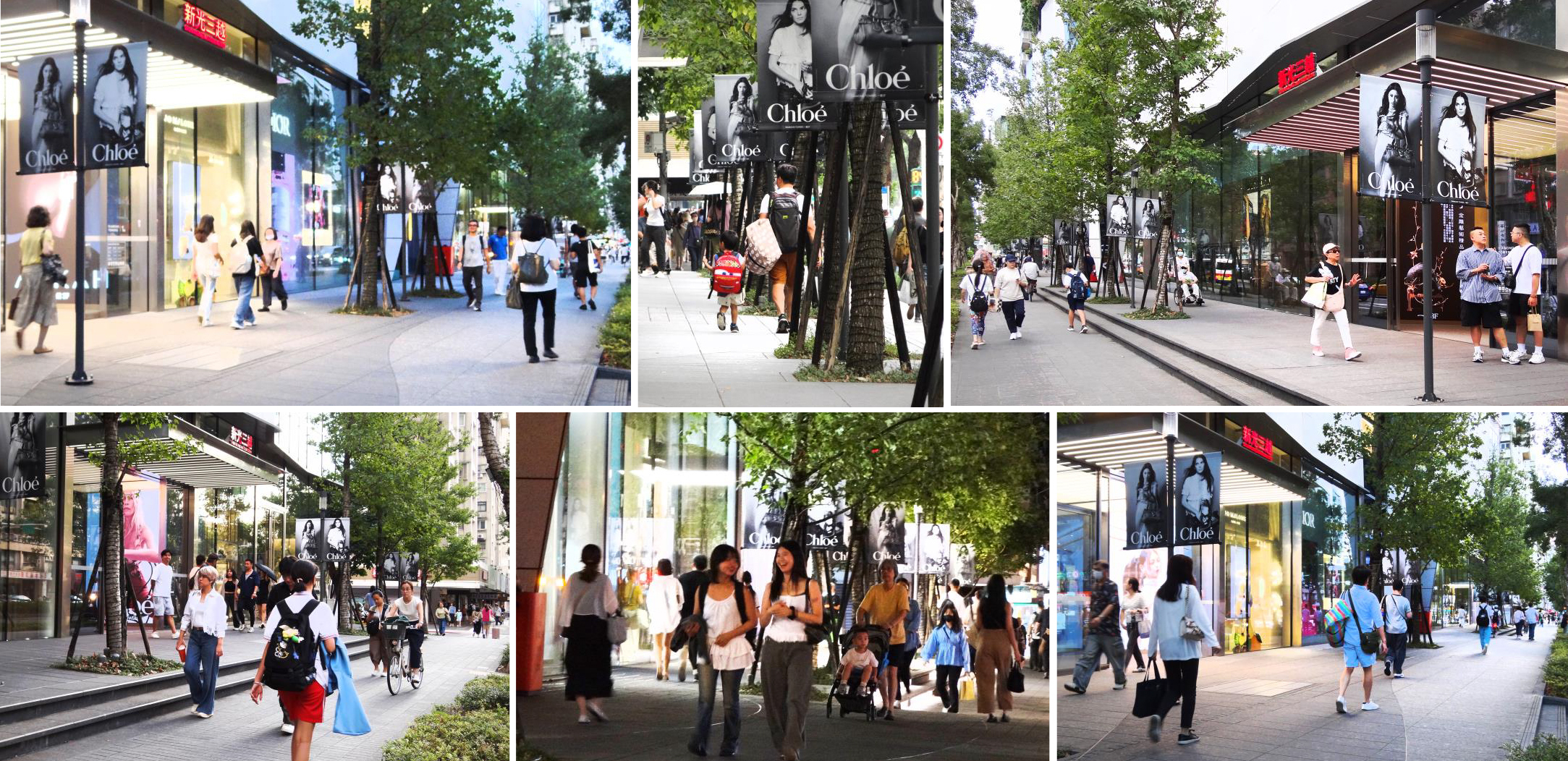 以流動線條串聯捷運廣場,形塑舒適宜人的都市步行空間。楓香行道樹隨時間變換色彩,從春夏的翠綠到秋季的紅楓,讓街道展現四季流轉的景致。綠色廊道為城市注入自然氣息,使人們在漫步中感受季節的節奏與生活的詩意。即便身處繁忙的都市生活,我們仍不忘追求與自然共生的生活方式,持續在此書寫人與自然和諧共處的城市篇章,讓日常步行不僅是移動,更成為一場感受自然與城市交融的美好旅程。