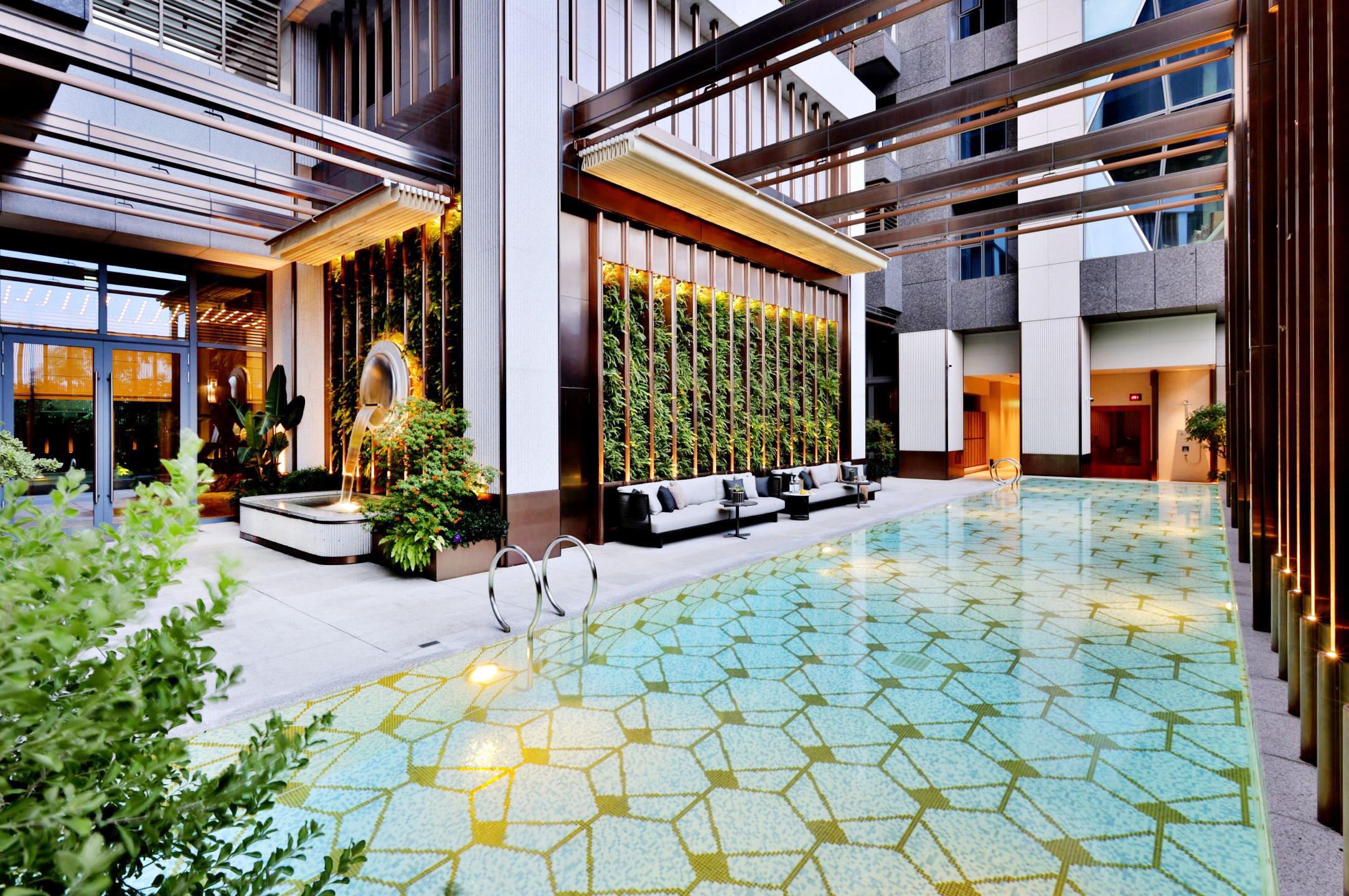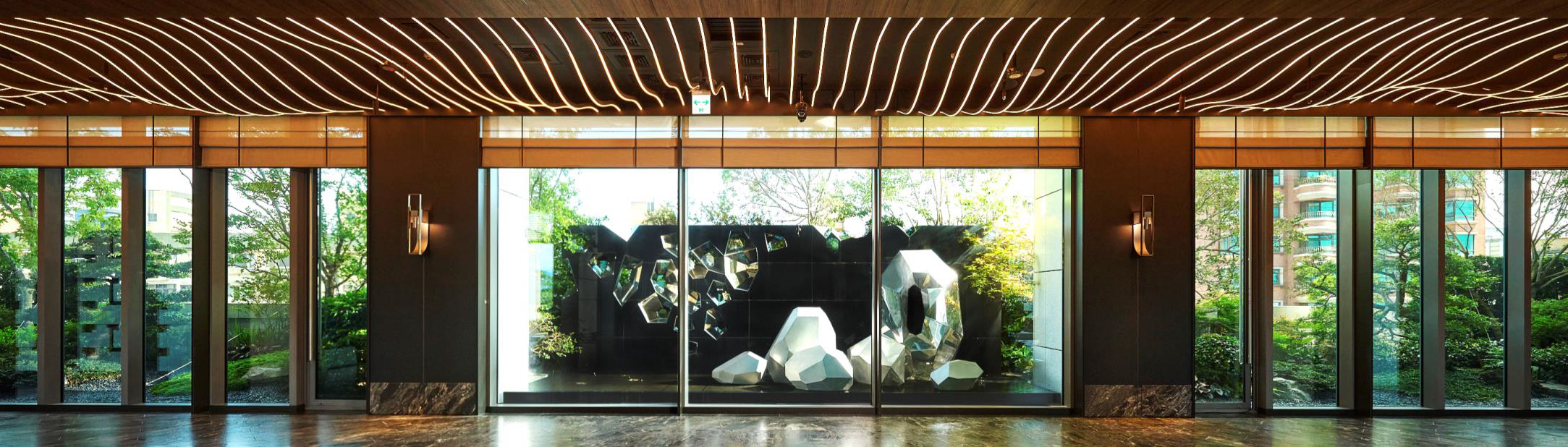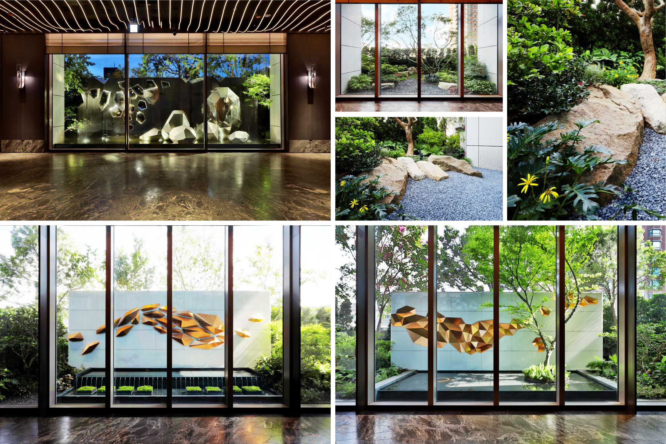 景觀設計以菱鑽的設計語彙,一座藝術裝置座落於一樓朝南的廊道之中。以重複而純粹的幾何單元為語言,交疊、連結、延展,構築出彷彿無限擴張的視覺意象,呼應建築本體的華麗姿態。作品選用黑、灰與透明鏡面不鏽鋼元件結合花崗石材質,層層切削出如鑽面般的多重折線,折射出細膩光影與晶體質感。金屬的鏡澤與石材的厚實交織出優雅而豐富的紋理,將珍貴與高雅的形體語彙融入建築脈絡之中,成為空間中耀眼的視覺焦點。