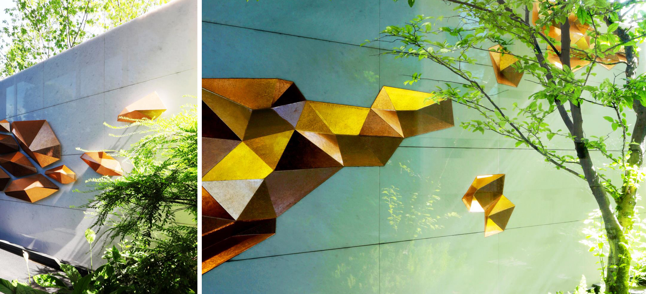 本案作品以「光影菱鑽」為靈感源起,將鑽石切面的語彙融入設計之中,使內外空間相互呼應、場域與環境彼此交融,展現出鑽石獨有的優雅氣質。這份菱鑽印象不止於形體的描摹,更內化為空間的語言——晶體般的造型融入牆體之中,映照並回應著 Diamond Tower 的核心概念與建築姿態。碎鑽般的元素被隨性灑落於深色石材牆面之上,宛如光影在空間間舞動,散發出自華麗魅力中迸發的生命力。每一顆晶體的中心皆鏤空貫通,讓風拂樹影、花姿搖曳的自然動態穿越其中,成為主露臺舞台上的自然配角,與建築共演出一場光、影、風、綠交織的詩意盛宴。