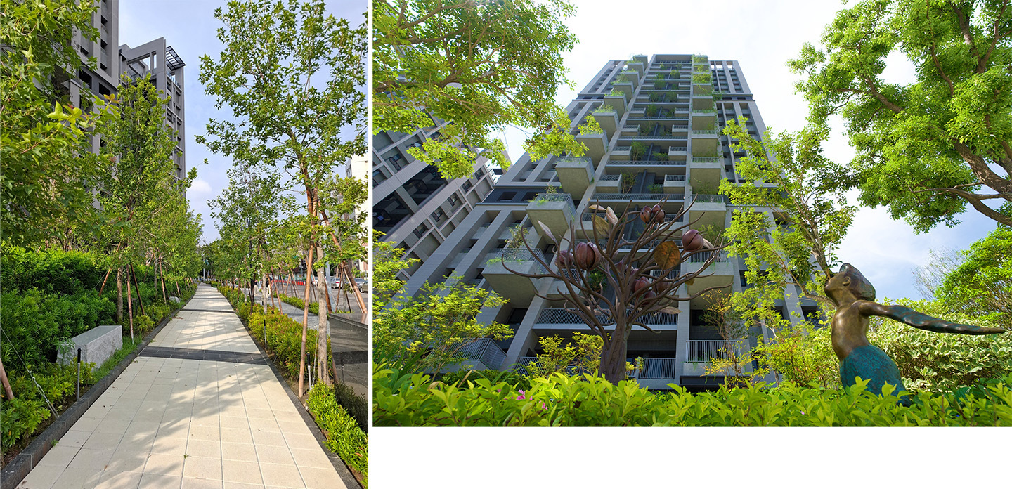 「大塊森濤」的景觀設計,以打造一座結合自然、生態與社區交流的綠色中庭為核心理念,總面積達3550平方公尺,宛如一座專屬於住戶的小型社區公園。中庭空間依不同使用需求規劃出多元場域,整體景觀提升了生活的舒適度與休閒性,也透過自然環境的引入調節微氣候,形塑出健康、宜居且充滿綠意的生活環境。
