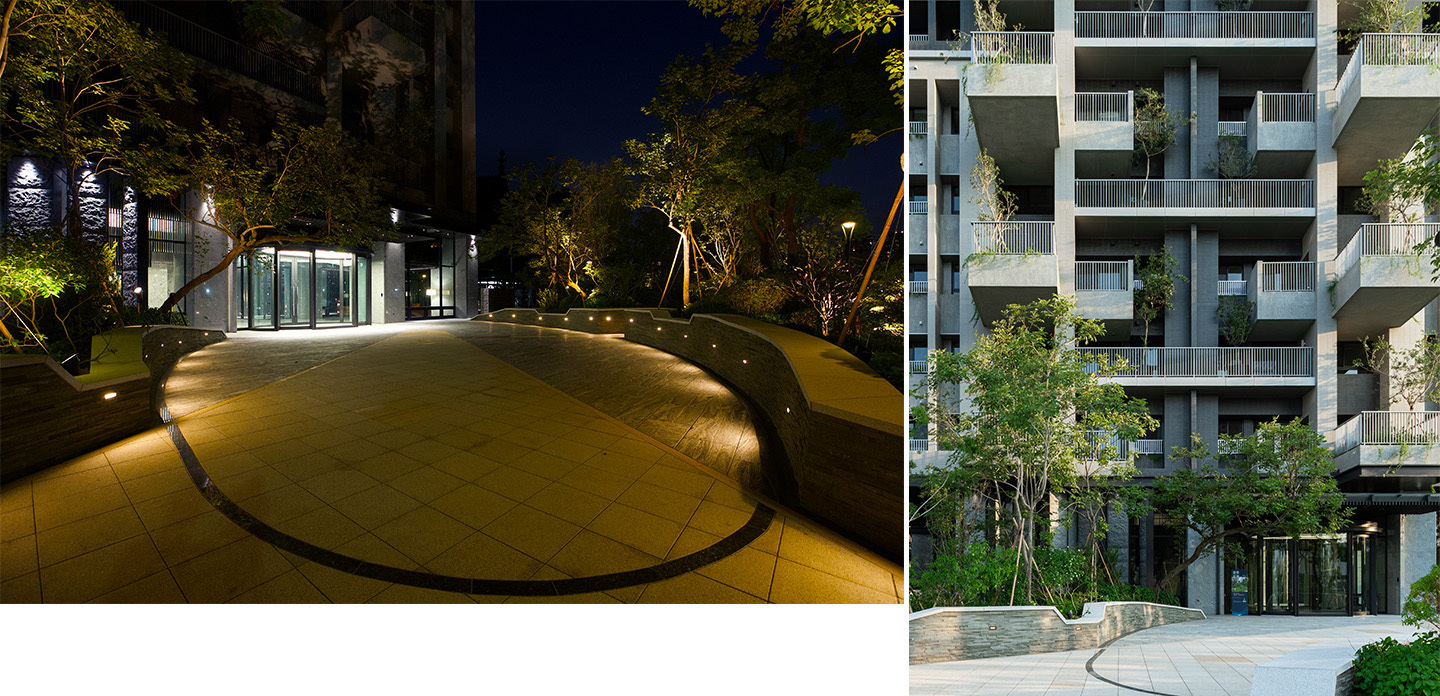 (左)圖6 入口廣場夜景以柔和燈光烘托空間氛圍,展現典雅迎賓意象並兼顧安全照明 (圖片來源:新業建設)