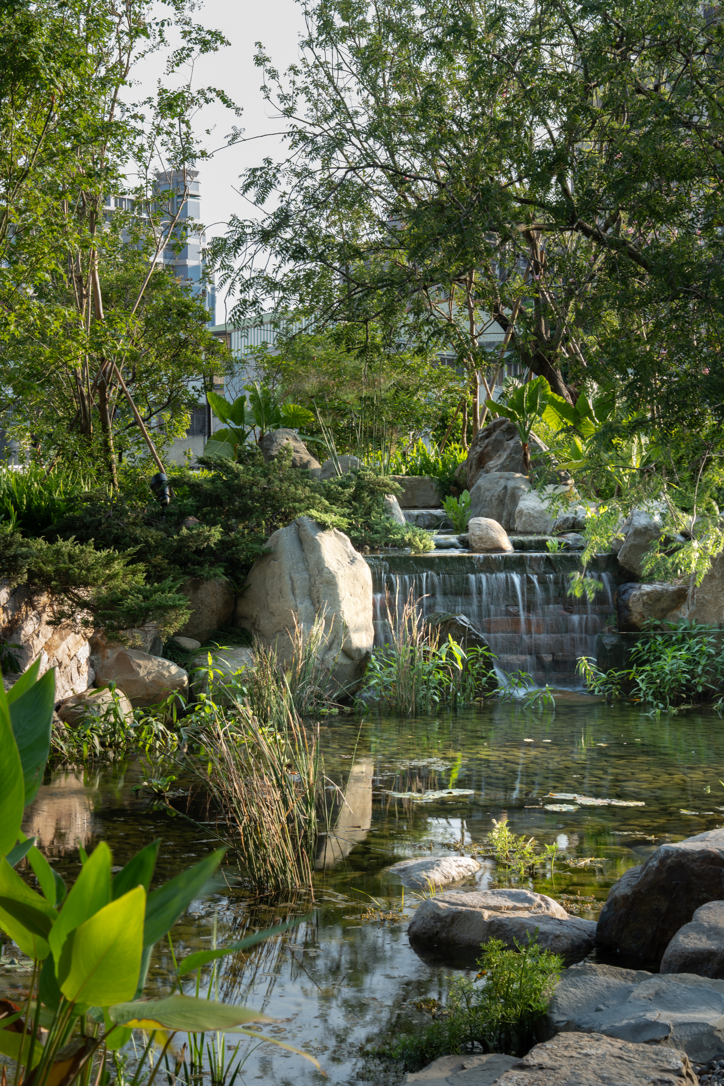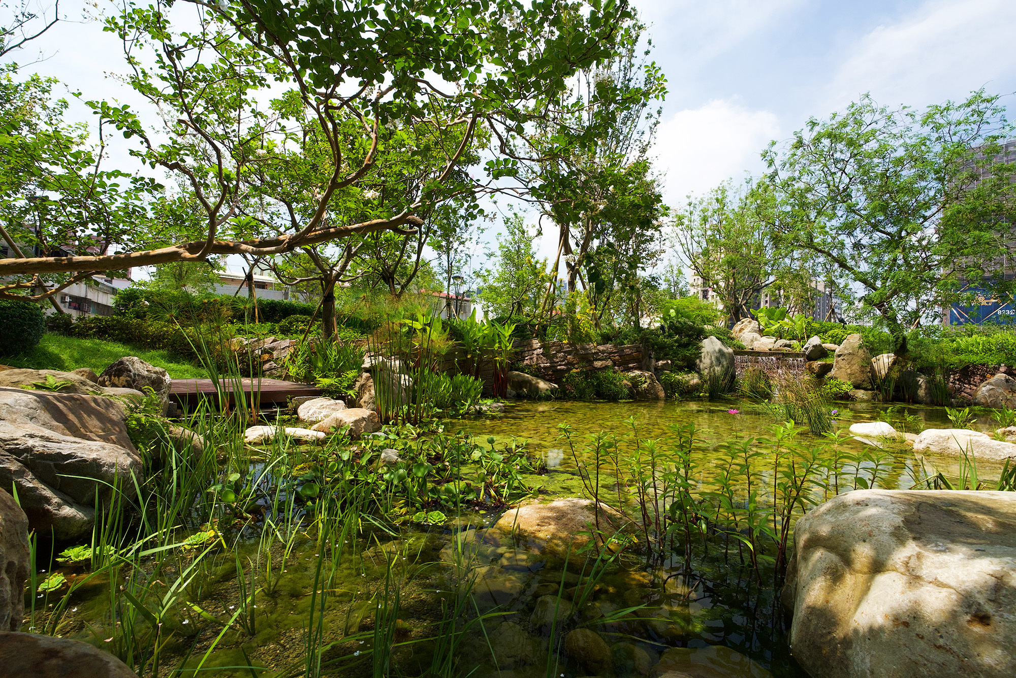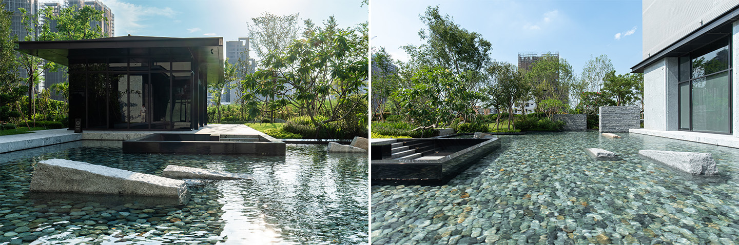 本區面積約753平方公尺,規劃以自然生態為核心,營造兼具水景與綠意的庭園氛圍。設計包含生態水池、蜿蜒溪流與跌水景觀,並導入奈米氣泡系統,以自然方式維持水質清澈與循環平衡。居民在使用閱讀室或健身房時,能透過窗景欣賞自然景致,達到舒緩心情、提振精神之效。