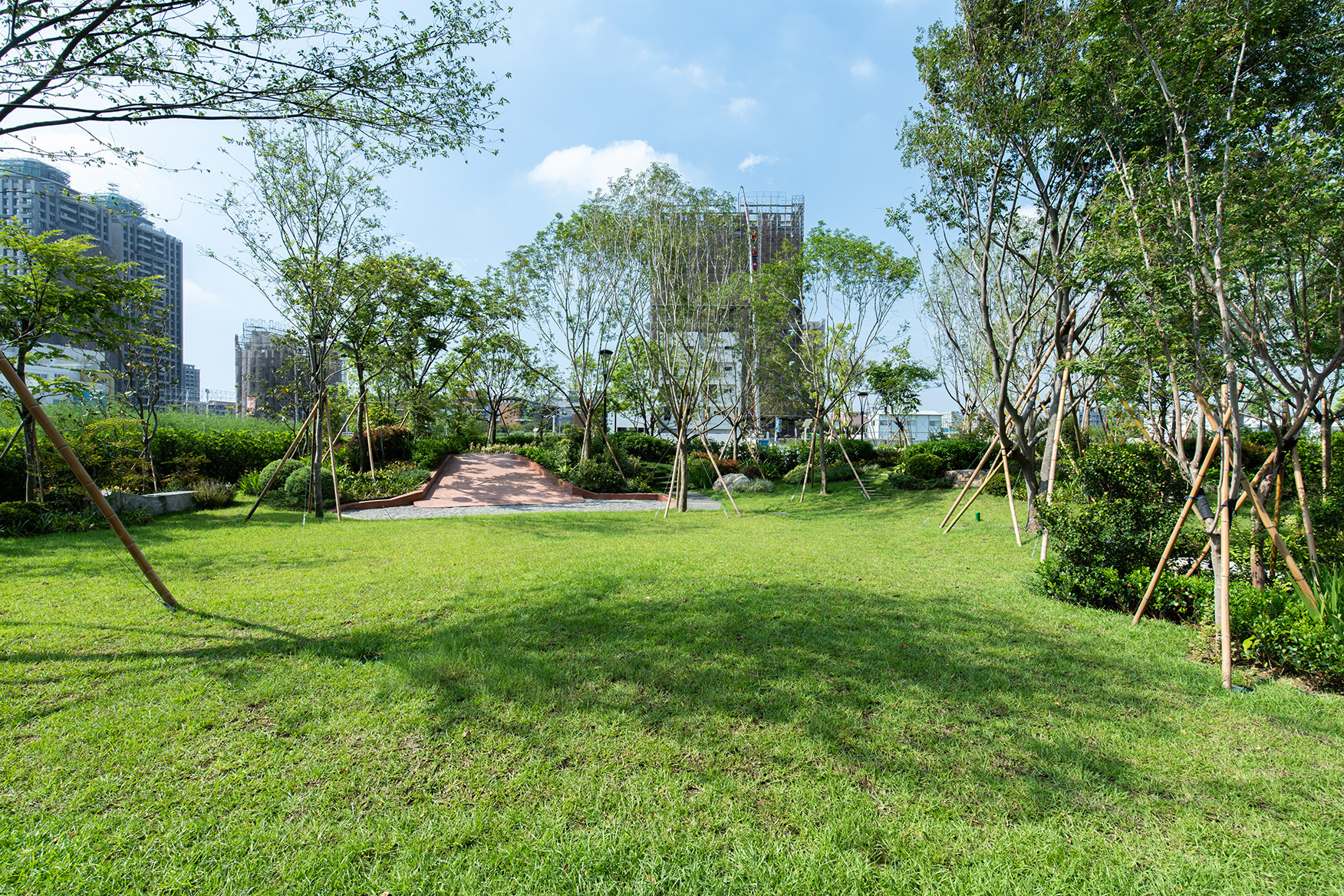 本區面積約1448平方公尺,整體以開放草坪與水景為主體,並由層次豐富的喬木林帶環繞,營造出融於自然的休閒場域意象。草坪廣場可作為兒童自在遊憩的活動空間,同時也是居民交流互動與舉辦社區活動的理想場域。另於大樓外部規劃大面積景觀水池,透過水體蒸散效應形塑微氣候,為環境帶來清涼宜人的氛圍,進一步提升居住品質。