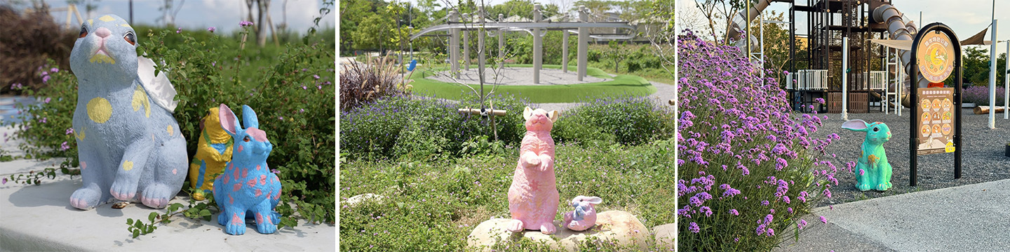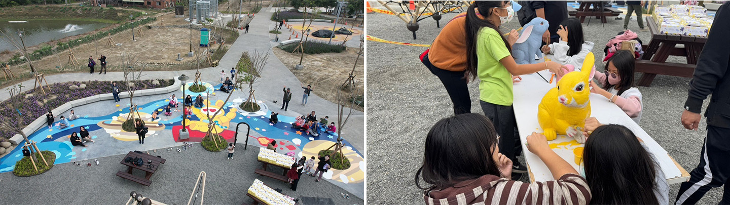 同時,結合鹽水在地特色舉辦彩繪大地及月兔活動,邀請在地藝術家團隊和國小師生共同參與遊戲場營造過程。彩繪地坪以「宇宙與兔大叔蜂炮」為主題, 結合鹽水的特色蜂炮,及月之美術館的吉祥物兔大叔,延伸到地面與立體雕塑,讓整個空間從視覺到使用都充滿互動與故事感, 實地彩繪共創鹽水童趣地景。