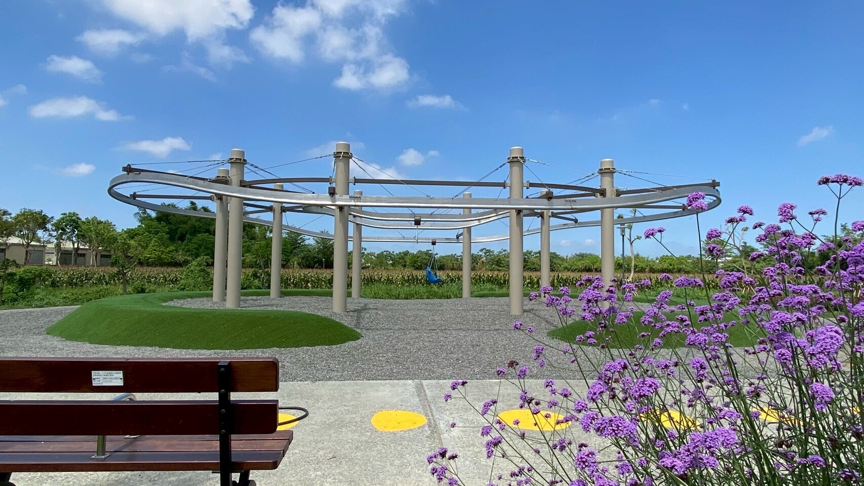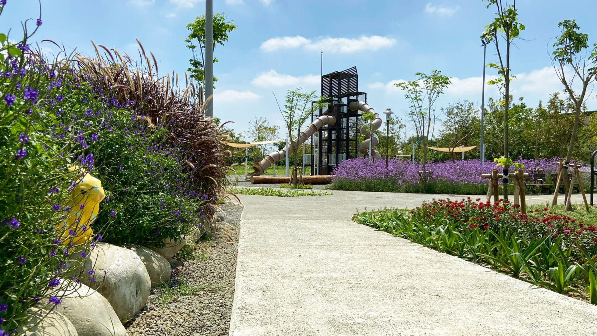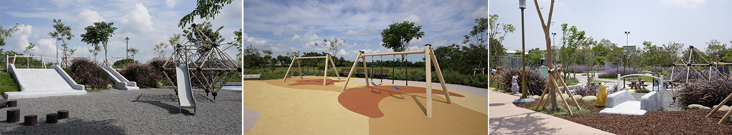 利用大卵石砌石工法營造自然特色之土丘地形,可做為眺望周邊農田地景的平台,結合無縫彈性地墊和礫石、木屑鋪面,設置磨石子溜滑梯、盪鞦韆、跳樁、攀爬網等設施。