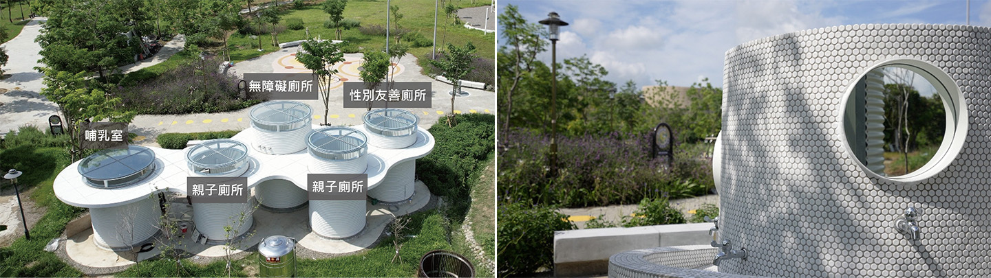 提供無障礙廁所、親子友善廁所及哺乳室,利用霧玻璃頂蓋與栽植創造獨特的體驗
