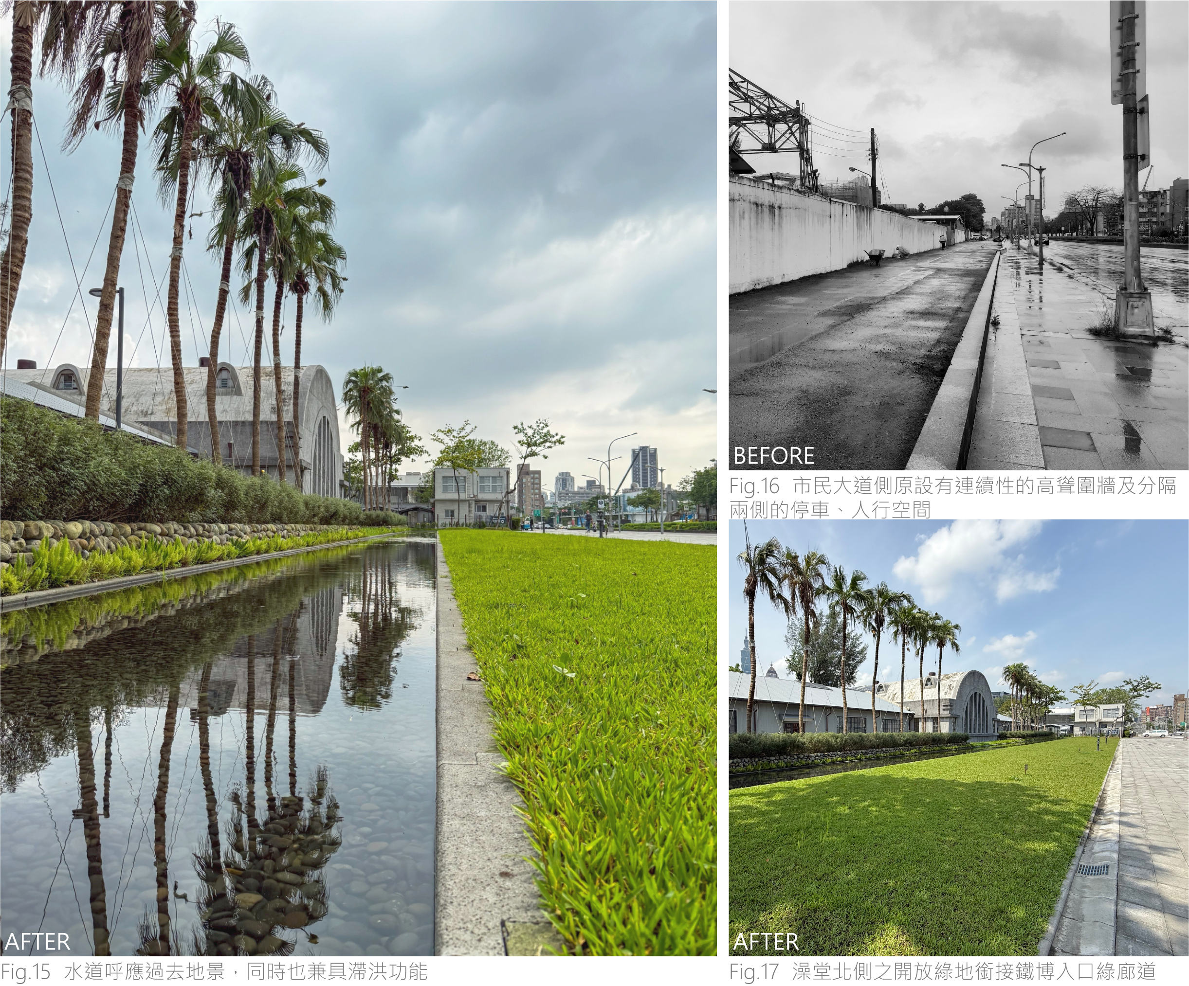 過往臺北機廠周邊大片的水田地景深植在曾經歷都市化過程的人們心中,為了將鐵道博物館與市民大道做適當地縫補與串接,澡堂修復後將澡堂北側的建築與圍牆拆除,設置象徵水圳的帶狀滯洪水帶、象徵水田的大草坪,以及因地下軌道頂版突出,於本次擴大、接順的人行空間,大範圍的開放空間連接建築物與市民大道,開放空間與建築物的關係,使修復後的澡堂立面更加突顯。