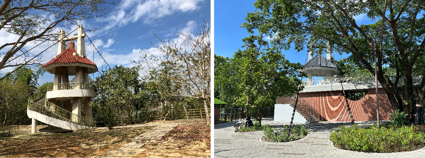 2. 光明吊橋為串聯紫竹寺與內門觀光休閒園區的重要動線,藉由本計畫一併美化橋塔立面,形塑地方特色地標;重新研擬立面色彩方案,塗裝顏色採低調簡約色系,減少對周邊環境視覺衝擊。