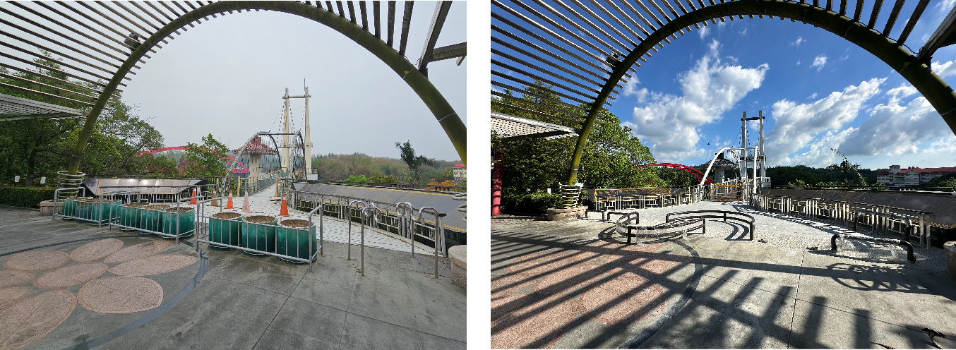 3. 北岸入口既有平台多已損壞及沉陷,為防止機車進入,以大型植栽槽進行阻擋,空間使用較不友善且影響視覺美觀;本計畫更換易維護且耐用之鋪面材料,營造友善無障礙通行環境之入口設施,簡化廣場元素。