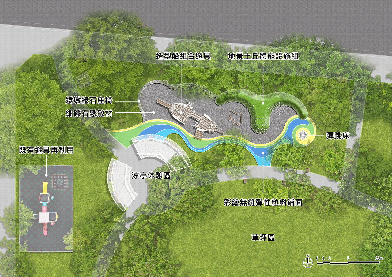 l 善用大樹林蔭,營造遮陰良好的樹下遊戲區,提供全天候舒適使用體驗。