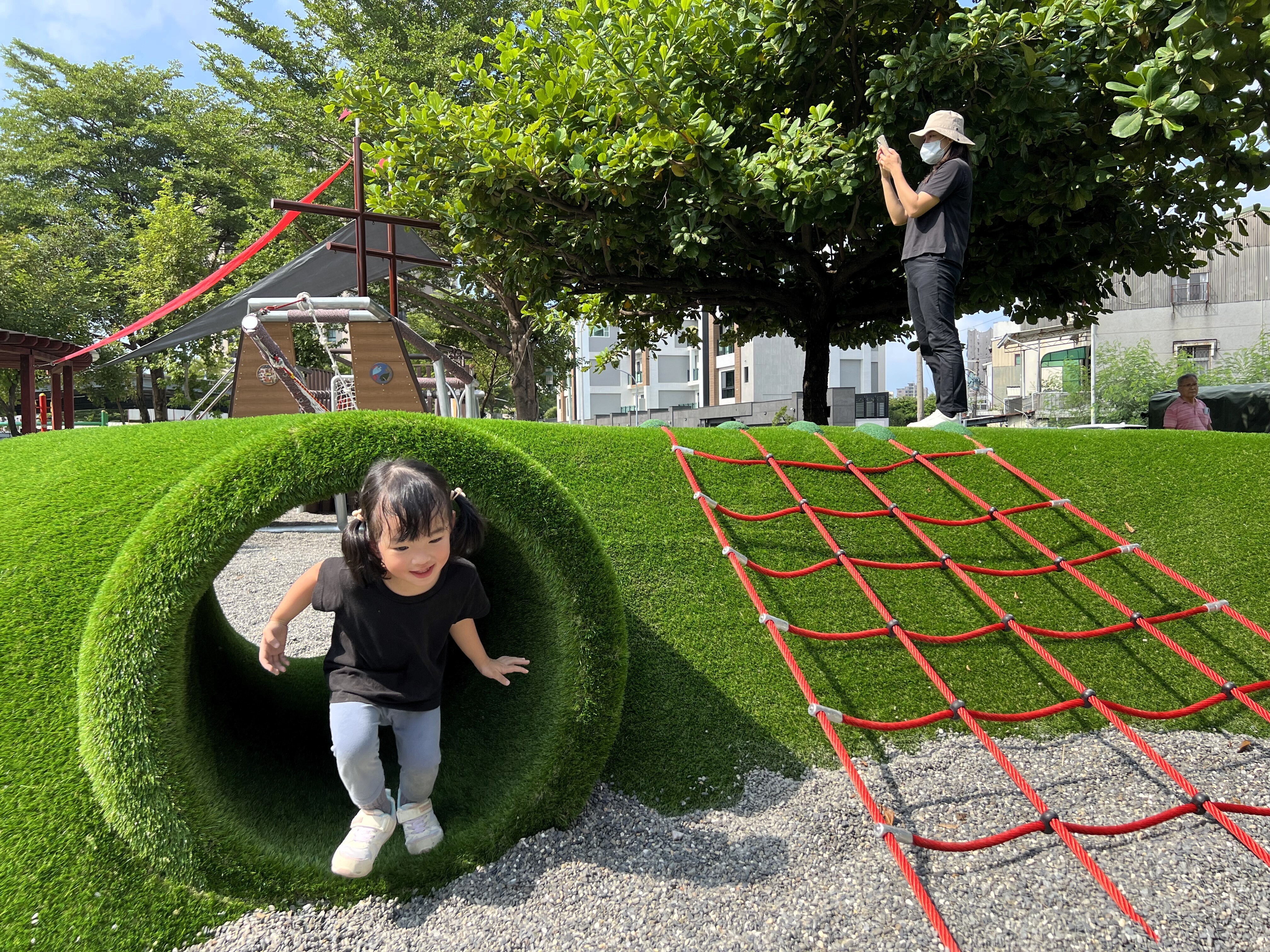 圖14 安全鋪面與友善設計,讓孩童自在探索草皮土丘、涵管與砂礫間的多樣遊戲體驗。