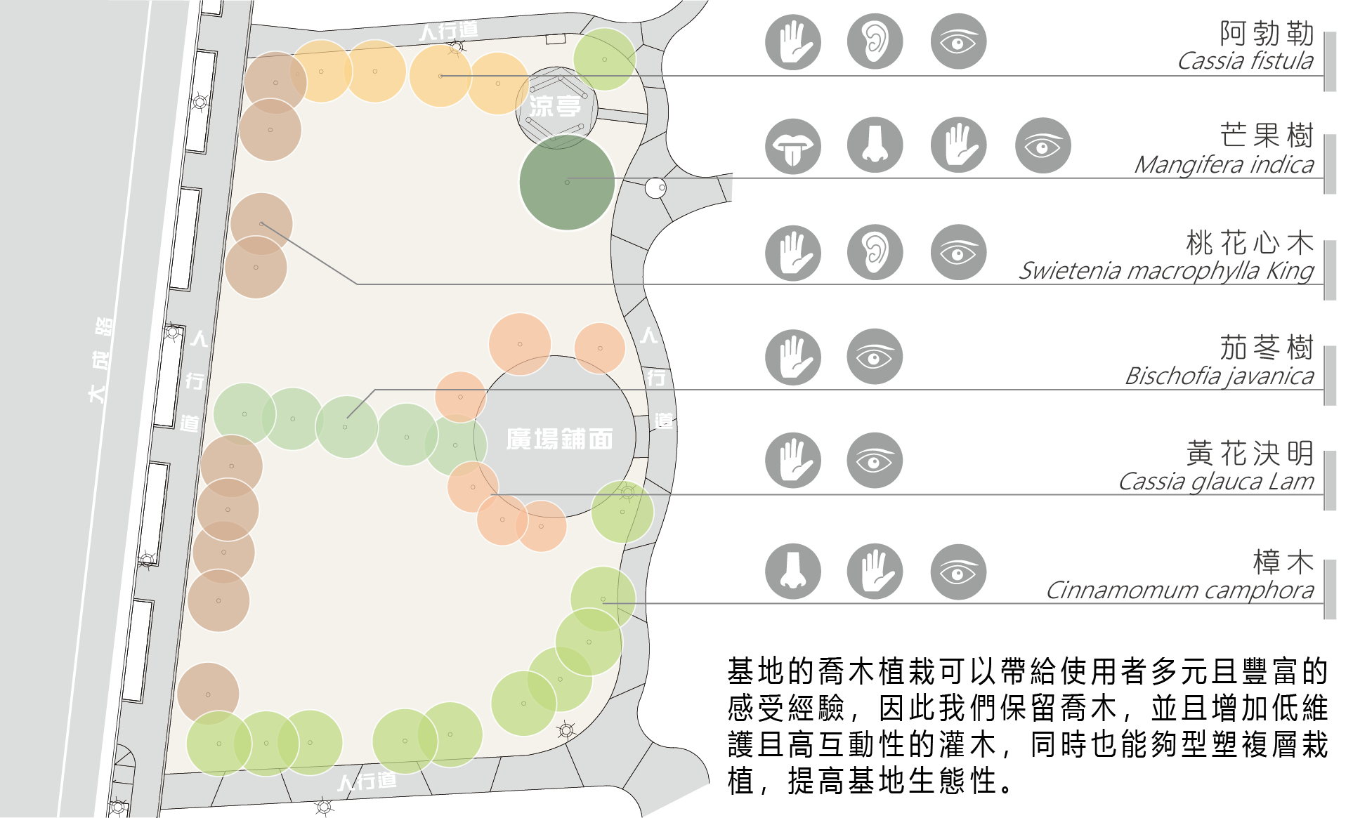 為提供使用者最舒適的環境,本團隊盡可能的保留現場喬木作為遮蔭,並調查個別樹種的特性可提供使用者互動之體驗。(例如芒果樹葉搓揉會有淡淡芒果香,孩童除攀樹摘果外,亦可以瞄準擊落樹上果實作為遊戲行為。)