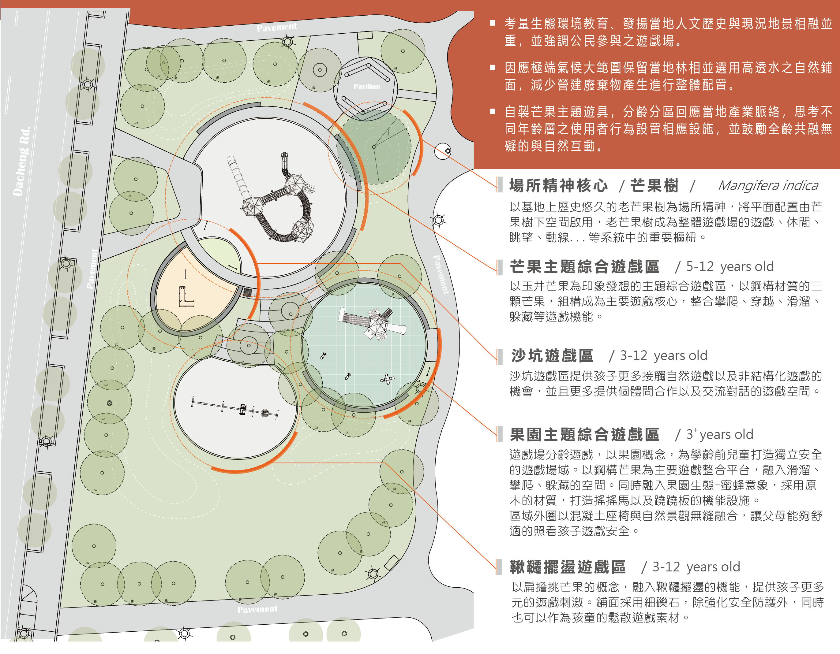 「芒果.樹.自然遊戲場」是考量生態環境教育、發揚當地人文歷史與現況地景相融並重,並強調公民參與之遊戲場。因應極端氣候大範圍保留當地林相並選用高透水之自然鋪面,以營建廢棄物最小化方式進行整體配置。自製芒果主題遊具,分齡分區回應當地產業脈絡,思考不同年齡層之使用者行為設置相應設施,並鼓勵全齡共融無礙的與自然互動。