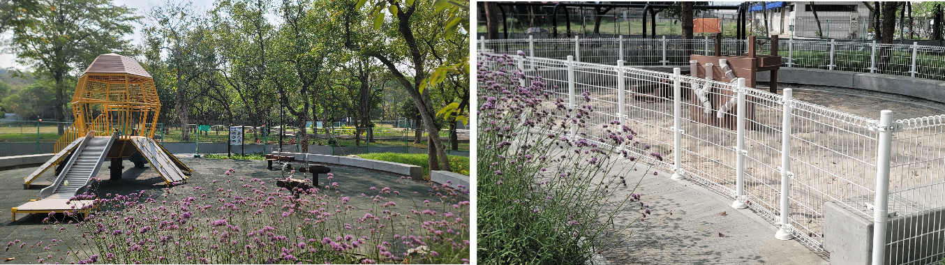 (右)圖 9 沙坑採用RC座椅圍塑,邊界設計圍欄,最外層以植栽區劃。