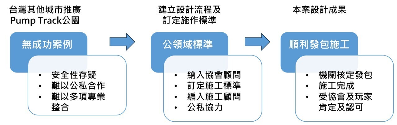 於設計階段細心聆聽民間專業協會的專業與知識傳遞,且配合勇於嘗試進步之業主,建立起一套良好的公領域Pump Track設計及施作標準,有助於全台北各區域Pump Track公園,甚至作為全台Pump Track發展公園之典範。
