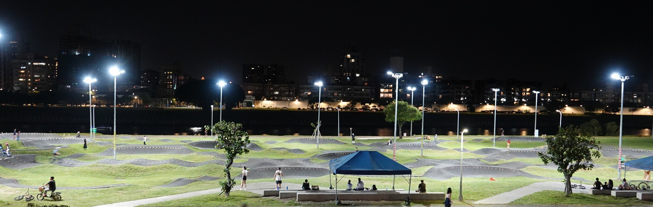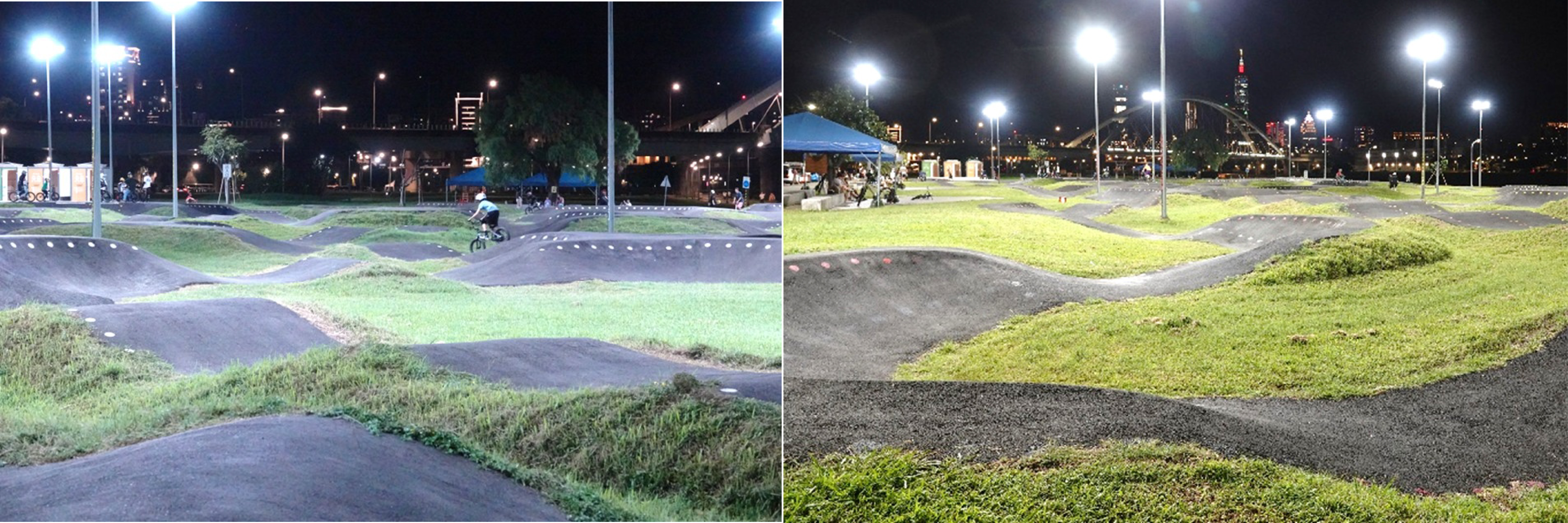 以非對稱式投光燈提供場區照明,均勻佈光且不外溢,避免對河濱生態及民房造成影響。完工後實際訪問場地使用玩家,表示場地燈光設計良好,提供台北夜間極限活動非常好的舒適照明,有別於一般河濱活動場地。