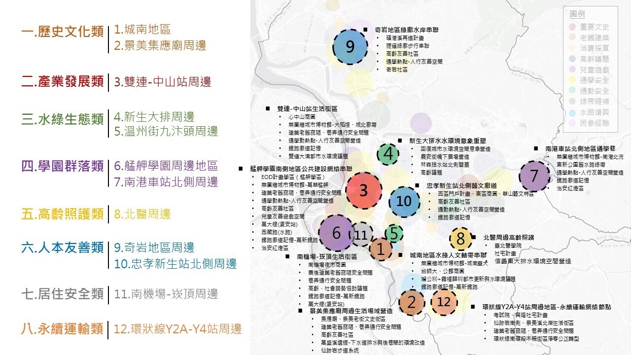 圖2 初步指認各類型示範街區位置示意圖 (圖片來源:臺北市都市更新處 -臺北市 生活巷弄計畫)