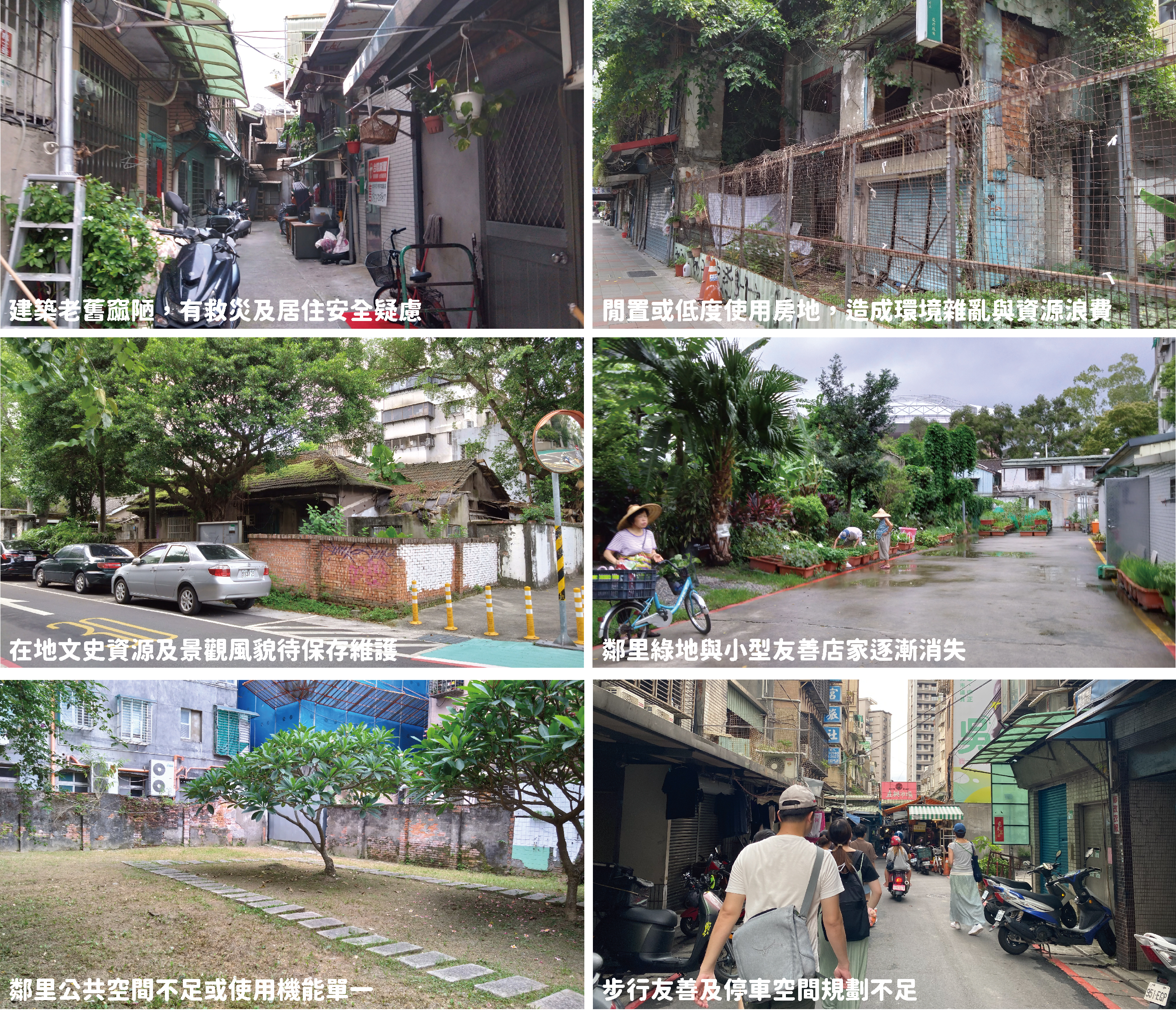 街區發展過程普遍涉及議題包含:建物居住安全、文史資源與街區特色保存、鄰里生活空間機能、交通及步行環境品質等面向: